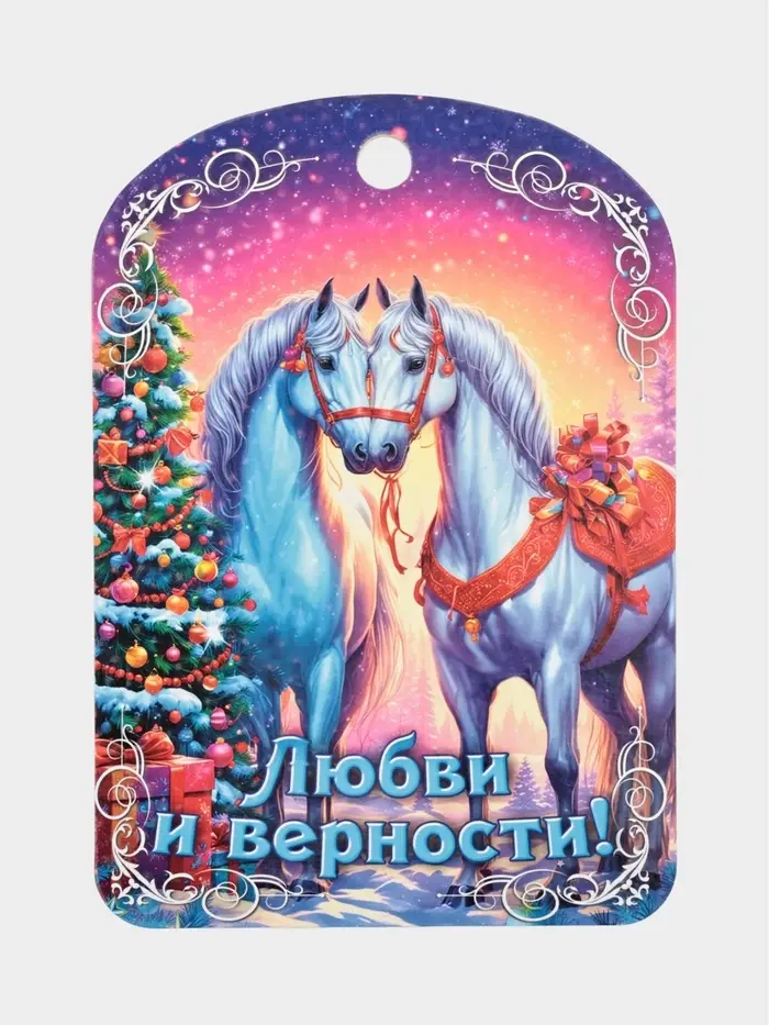 - Посвящена лошади — символу года 2026, и дополнена пожеланием, особенно уместным для пар, близких людей и тех, кто ценит доверие и преданность.