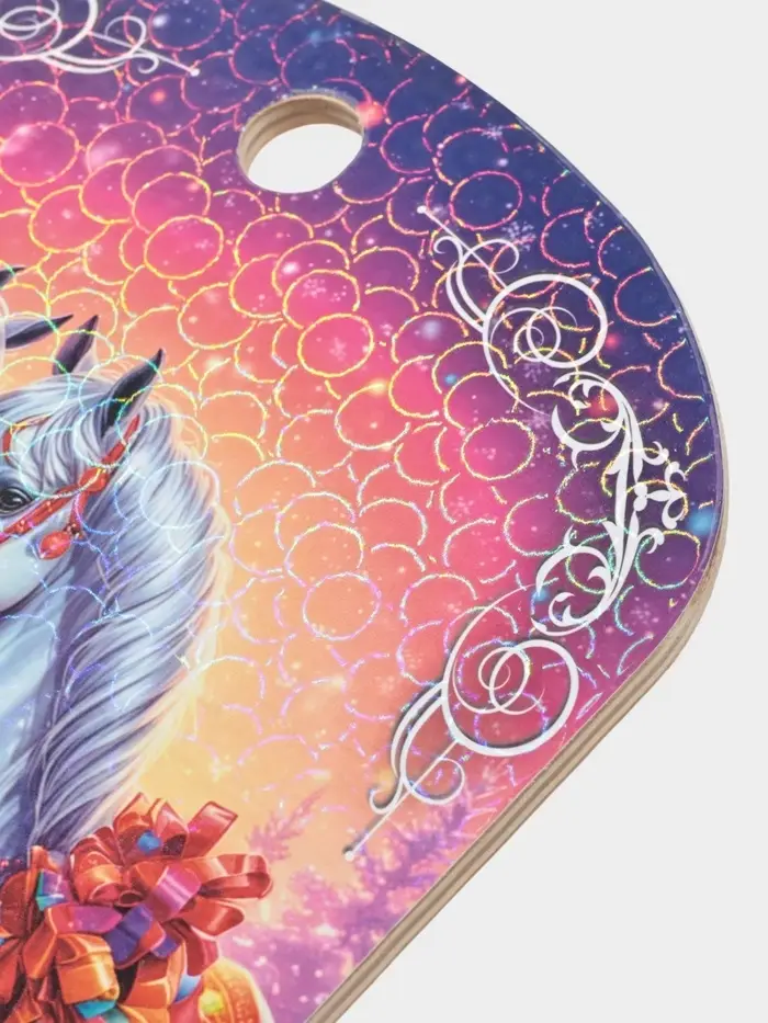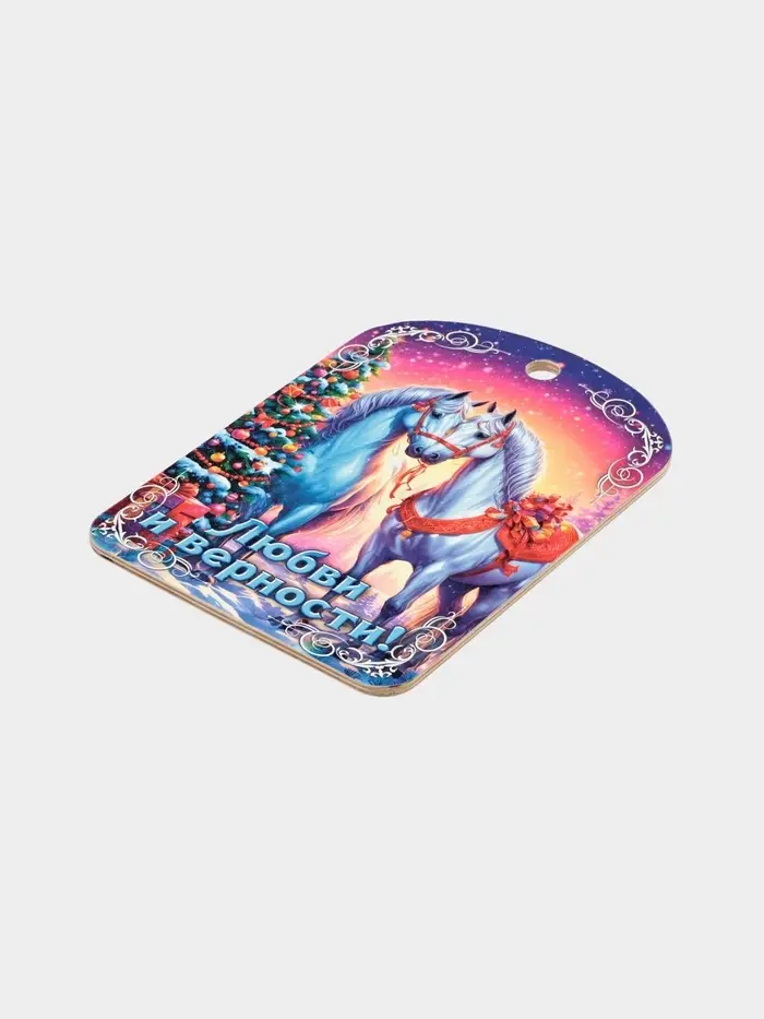 Разделочная доска «Лошадь — символ 2026 года. Любви и верности!» — это тёплый новогодний сувенир, в котором соединяются домашняя забота и глубокая символика восточного календаря. На деревянной поверхности — изображение лошади, окружённой праздничными мотивами и надписью ”Любви и верности!“. Доска подойдёт для нарезки сыра, фруктов или овощей к праздничному столу, а после легко превратится в украшение: её можно повесить на стену или дверцу кухонного шкафа, чтобы сохранить атмосферу искренних пожеланий.