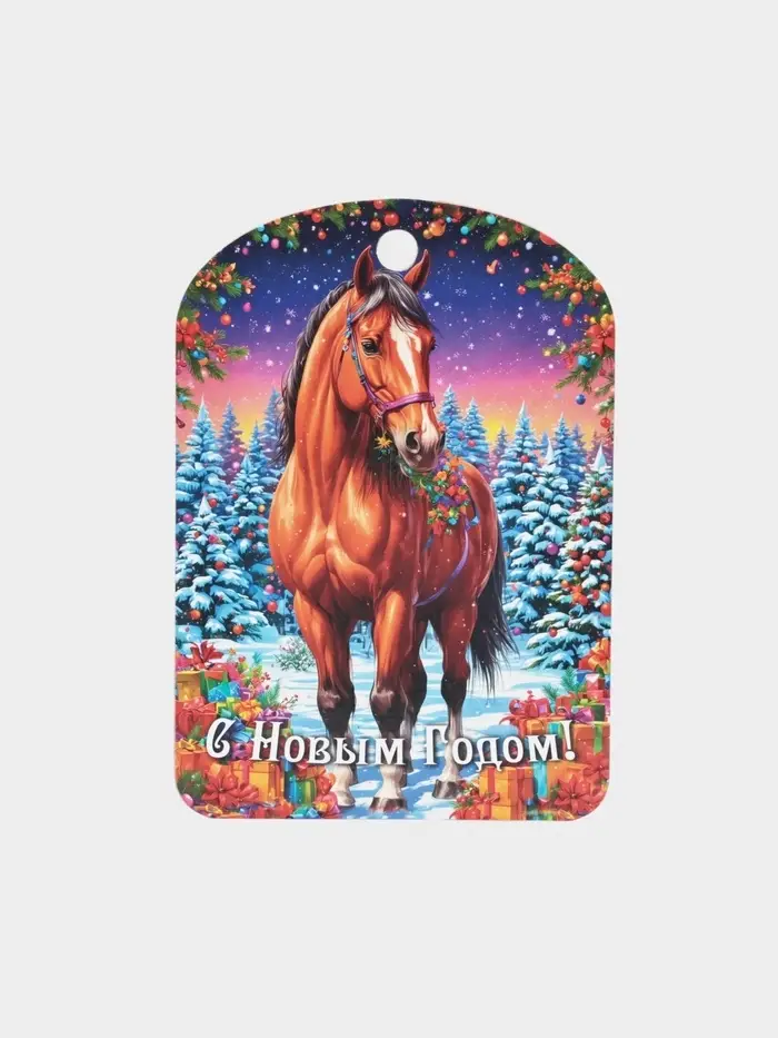 - Посвящена лошади — символу года 2026, и дополнена универсальным поздравлением, уместным для любого получателя.
