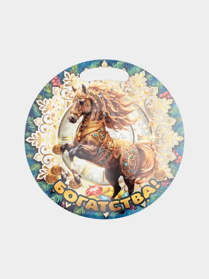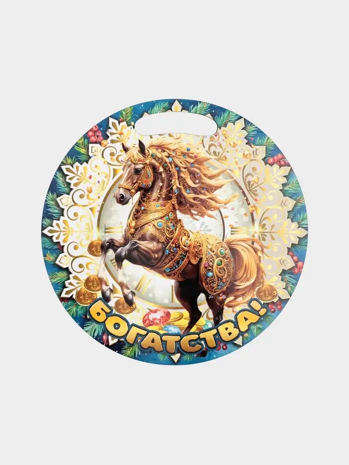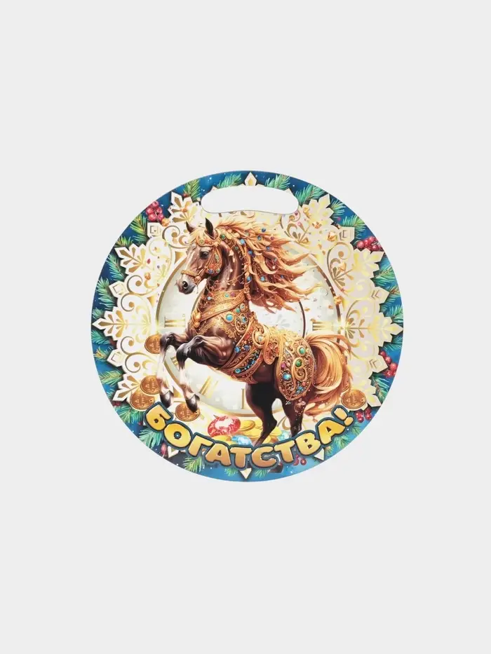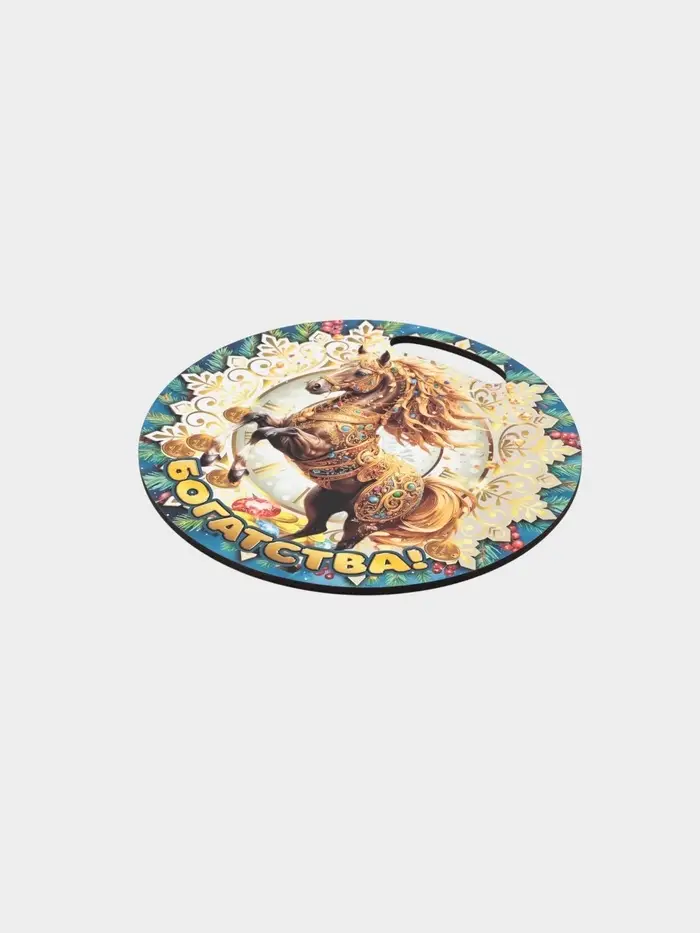 В восточной культуре лошадь — символ упорства, энергии и удачи в делах. Круглая форма подчёркивает завершённость и полноту, а пожелание ”Богатства!“ задаёт тон на весь год. Эта доска — не просто кухонный аксессуар, а талисман с намерением: пусть труд приносит плоды, а дом никогда не знает нужды. Подарите её тому, чьи усилия вы цените — и пусть каждый взгляд на неё напоминает: новый год — время для роста, возможностей и щедрости жизни.