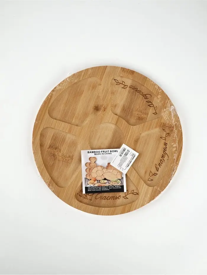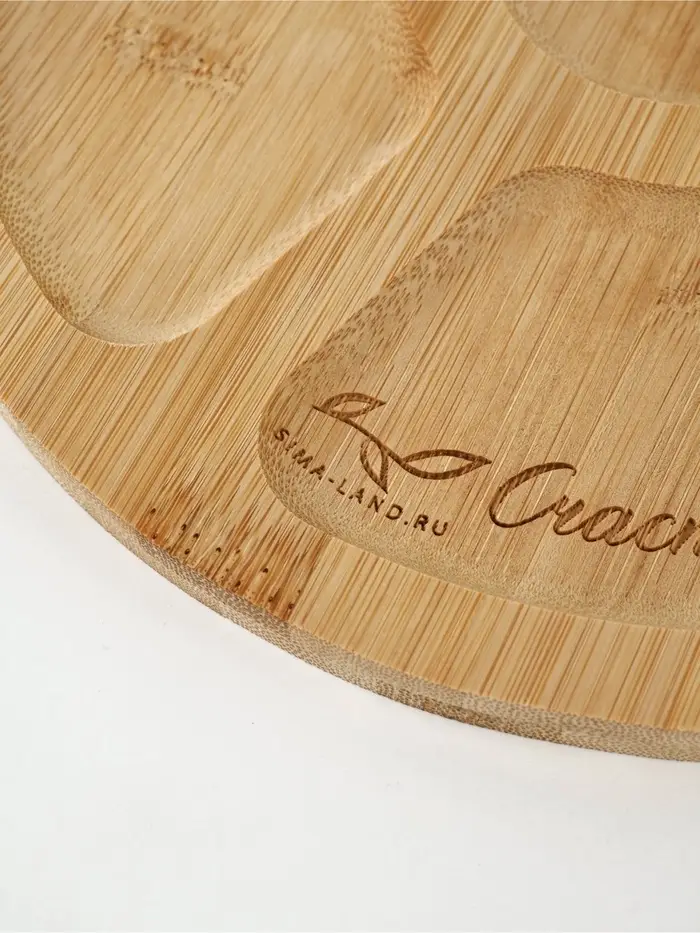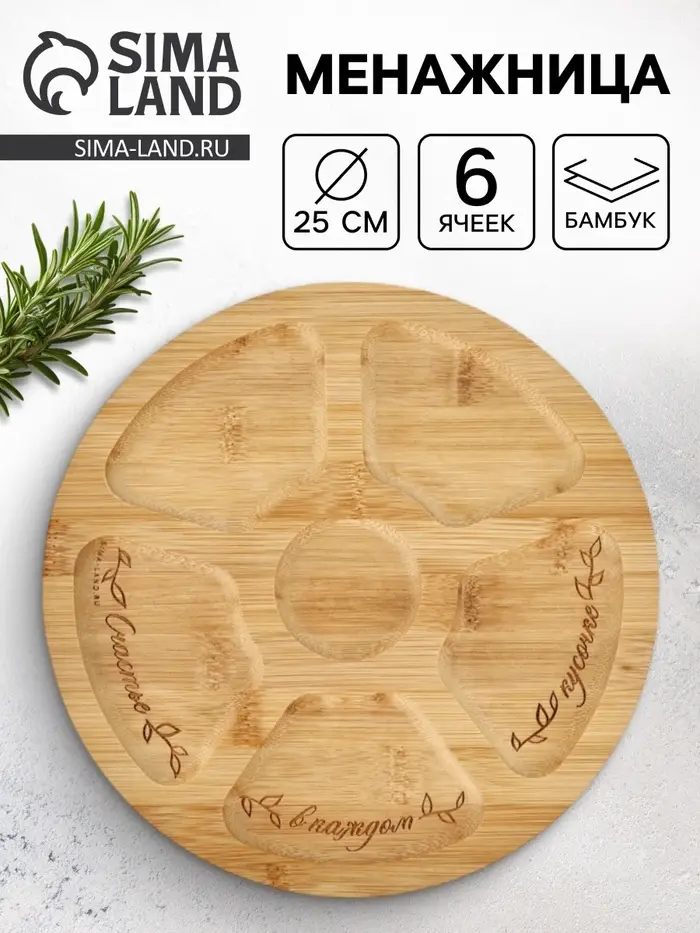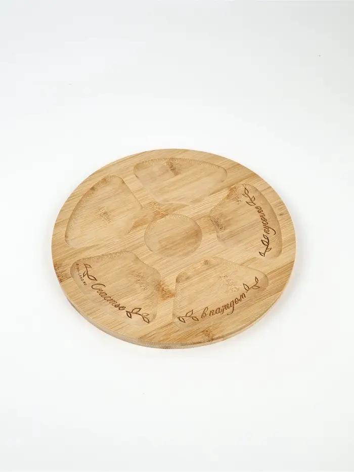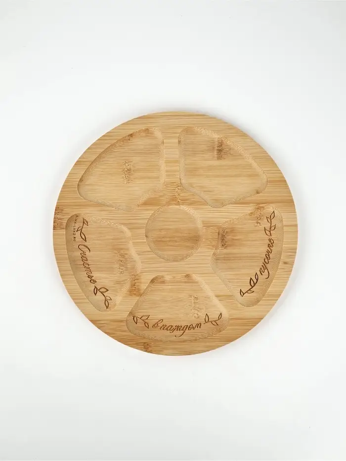 Менажница «Цветы» — это фраза, расцветшая по кругу. Бежевый бамбук, как страница старой тетради, и шесть ячеек — пять по краю, одна в центре, будто лепестки вокруг сердцевины. Через три из них плавно проходит надпись: ”счастье — в каждом — кусочке”, разложенная не по строке, а по движению руки, подающей угощение.