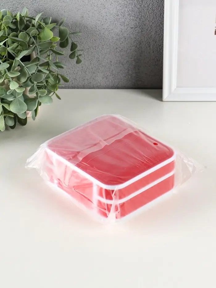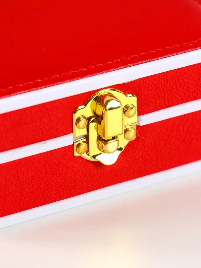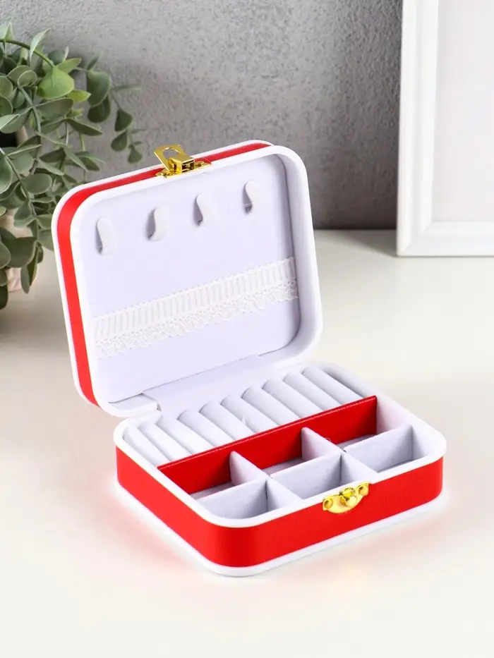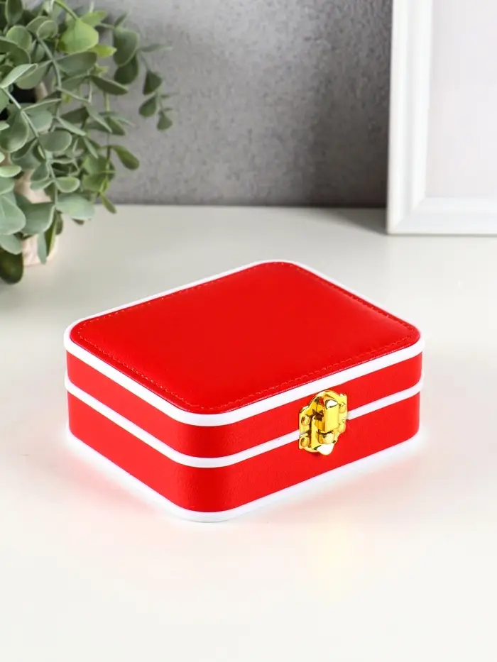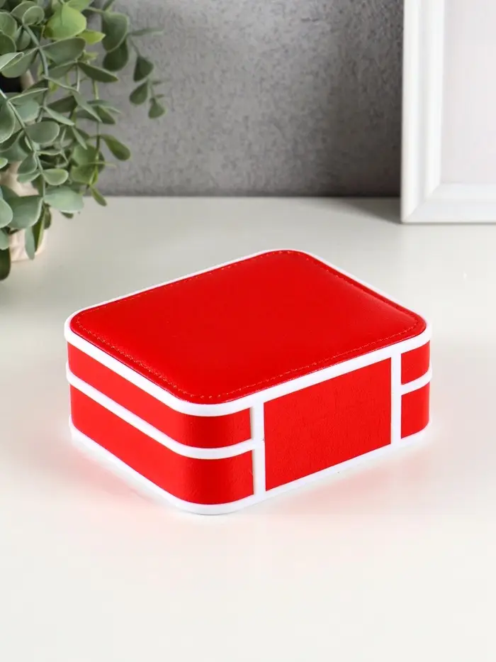 Шкатулка пластик, кожзам для украшений 6 ячеек, 10 полос, красная 13,5х11,5х5,5 см