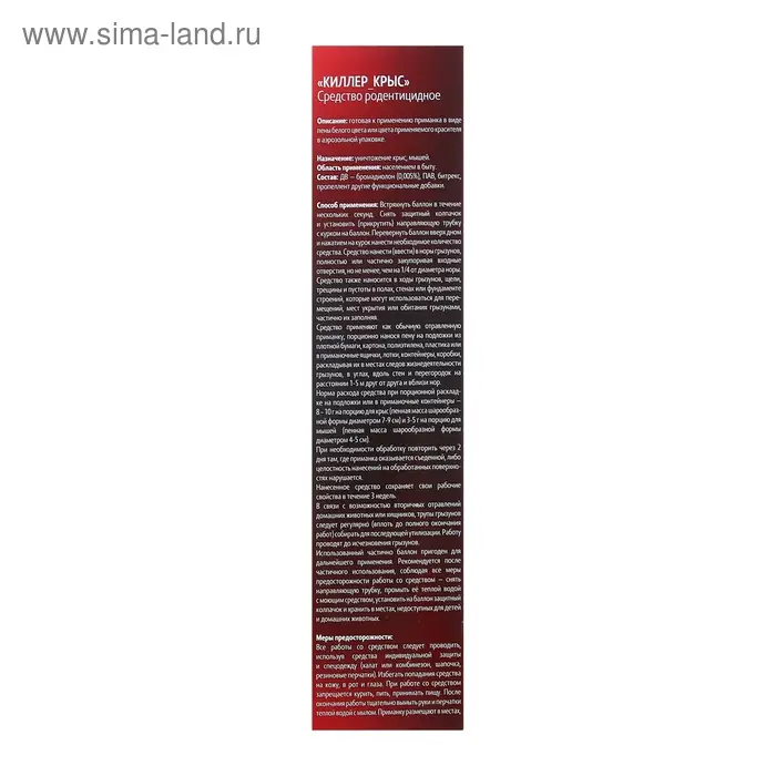 Состав: бромадиолон (0,005%), ПАВ, битрекс, пропеллент другие функциональные добавки.
