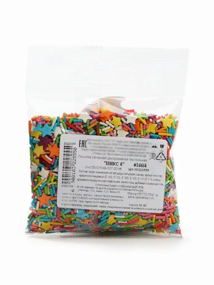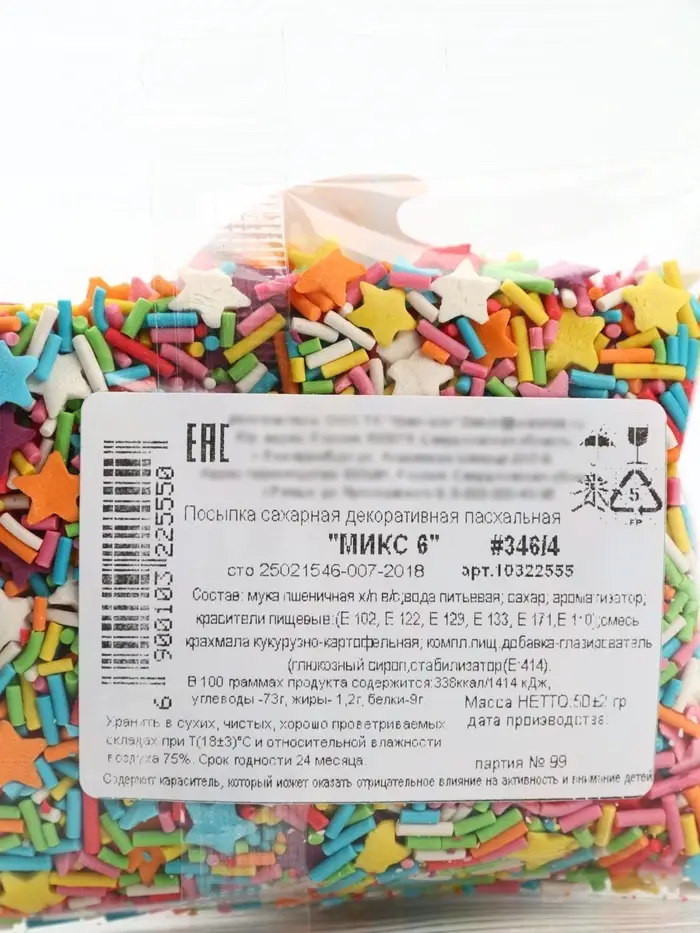 Состав: мука пшеничная х/л в/с; вода питьевая; сахар; ароматизатор; красители пищевые: (Е102, Е122, Е129, Е133, Е171, Е110); смесь крахмала кукурузно-картофельная; стабилизатор: полируюущая смесь (Е414).