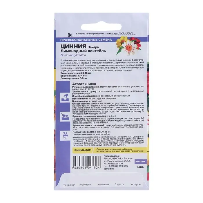 Супервыносливая серия карликовых цинний нового поколения для любительского и профессионального озеленения, не требующая специального ухода! Кустики компактные, высотой 30-45 см, хорошо ветвятся. Цветки очень яркие и праздничные различной окраски диаметром 5-6 см. Отличительными признаками сортосерии Захара являются: насыщенные и уникальные окраски цветков, длительный период цветения, повышенная толерантность к грибковым заболеваниям. Широко используется для оформления цветников, посадок в контейнеры и балконные ящики, для выращивания в вазонах и открытом грунте. Растение относительно засухоустойчиво, но требует регулярных поливов, чувствительно даже к легким заморозкам. Предпочитает солнечные, защищенные от ветра теплые участки с дренированной нейтральной, богатой гумусом и минеральными элементами почвой. Посевы на рассаду проводят с конца марта под стекло. Глубина заделки семян 0,5 см. При температуре +22…+25°С всходы появляются на 7-10 день. С развитием первой пары настоящих листочков сеянцы пикируют в отдельные горшочки. В фазе 5-6 листьев проводят формирующую прищипку. В открытый грунт на постоянное место рассаду высаживают в конце мая – начале июня, когда минует угроза заморозков. Схема посадки – 20х20 см. Возможен прямой посев семян в открытый грунт в мае.