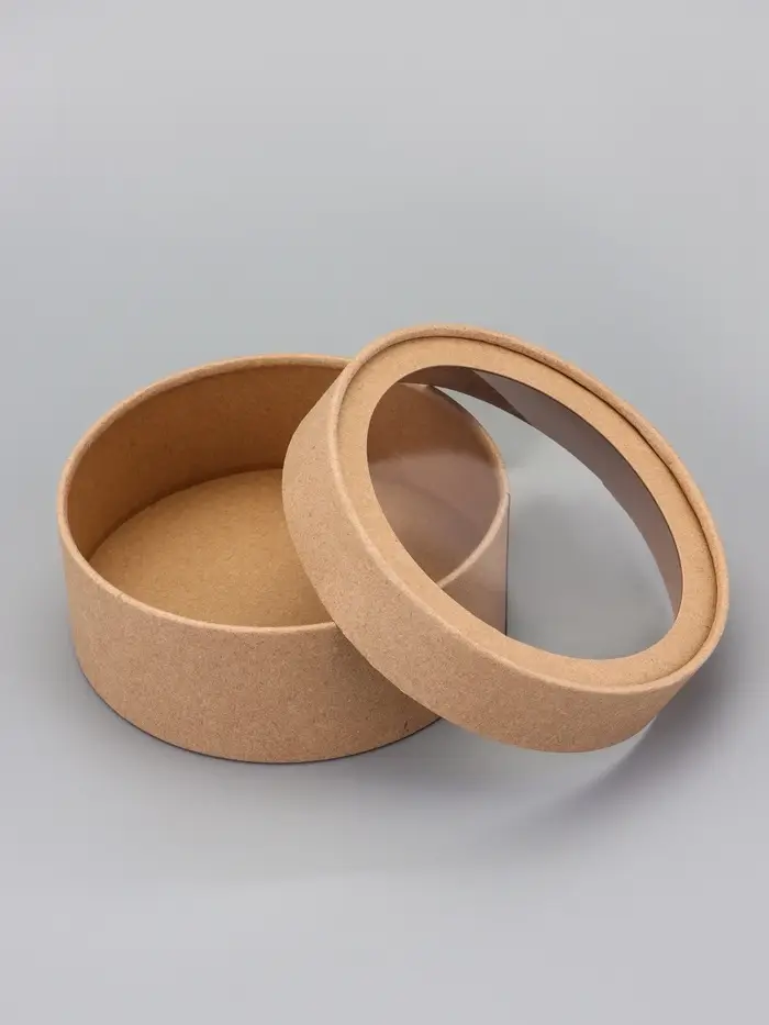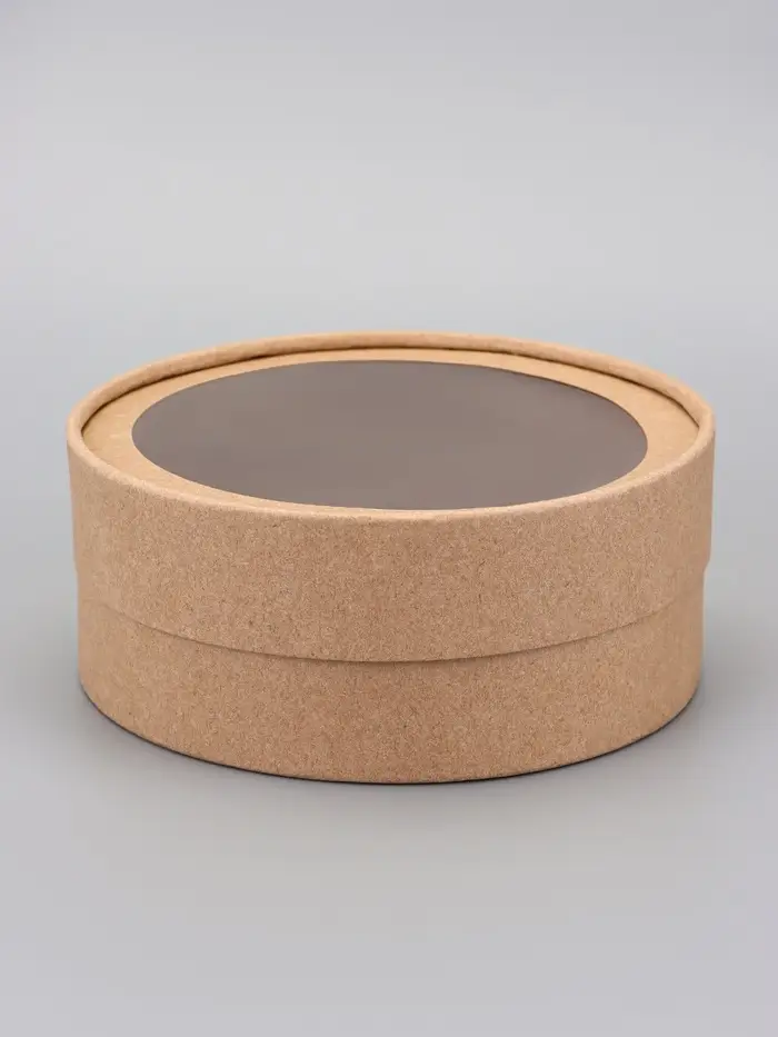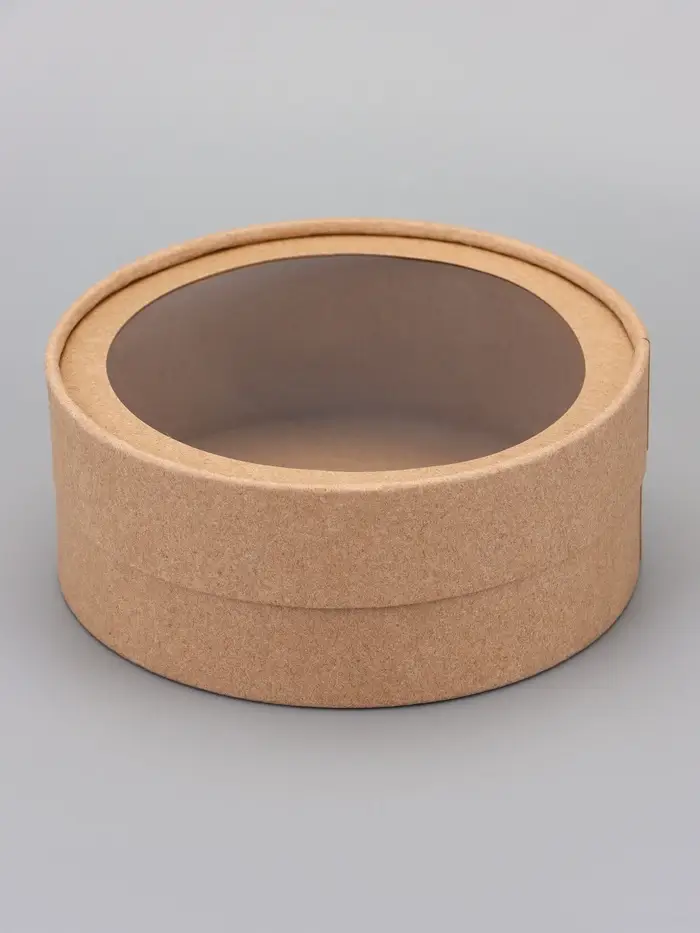 Коробка круглая подарочная, завальцованная с окном, крафт, 15×6 см