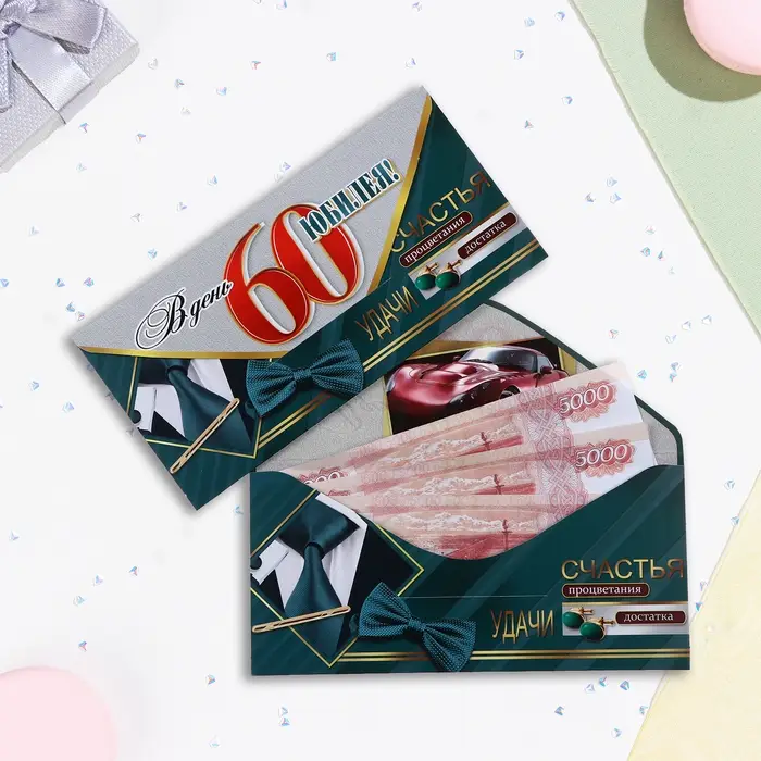 Конверт для денег "В День Юбилея 60! Долгих и счастливых лет!" бант, 16,5 х 8 см