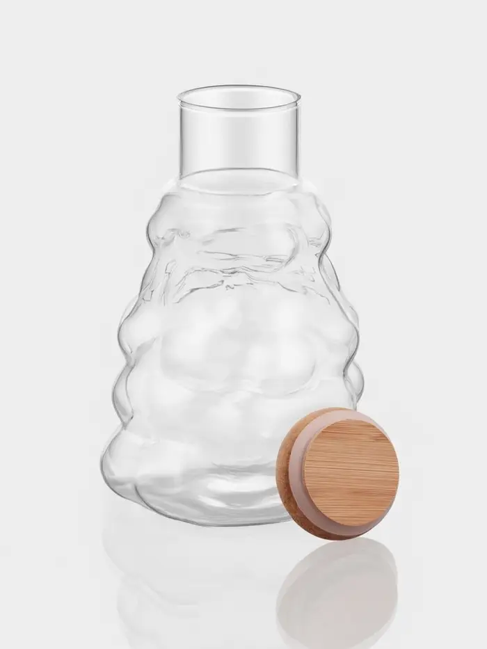 - Бамбуковая крышка: плотно закрывает горлышко, защищая содержимое от пыли и посторонних запахов. Натуральный материал сочетается со стеклом и подходит для любого интерьера — от кухни в стиле лофт до дачной веранды.