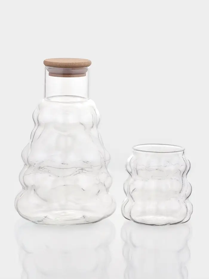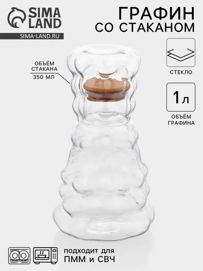 Графин со стаканом и бамбуковой крышкой — это продуманная посуда для воды, сока или домашних напитков. Объём 1 литр, прозрачное стекло с фактурной поверхностью и комплектный стакан на 350 мл делают его практичным для ежедневного использования и сервировки за праздничным столом.