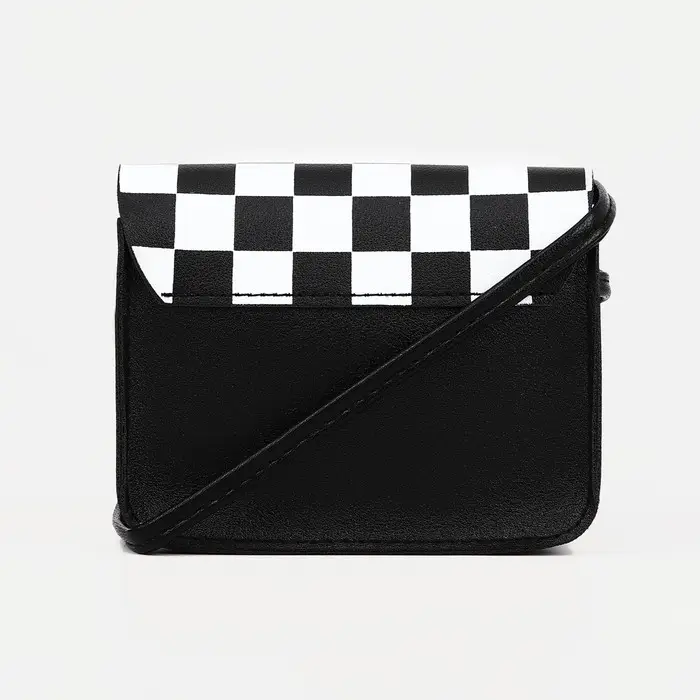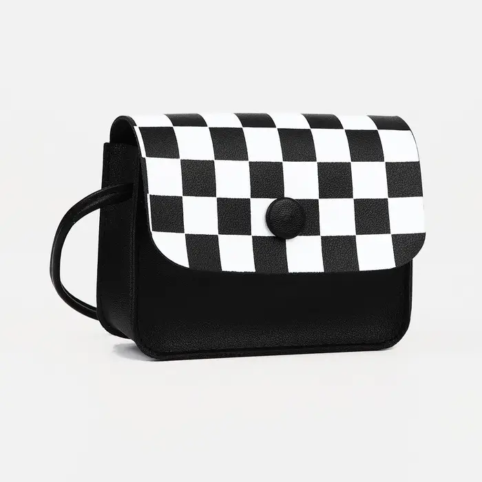 Чёрная детская сумка через плечо с клетчатым принтом — стильный аксессуар для маленьких модниц. Магнитная застёжка обеспечивает лёгкий доступ к содержимому, а регулируемый ремень подстраивается под рост ребёнка.