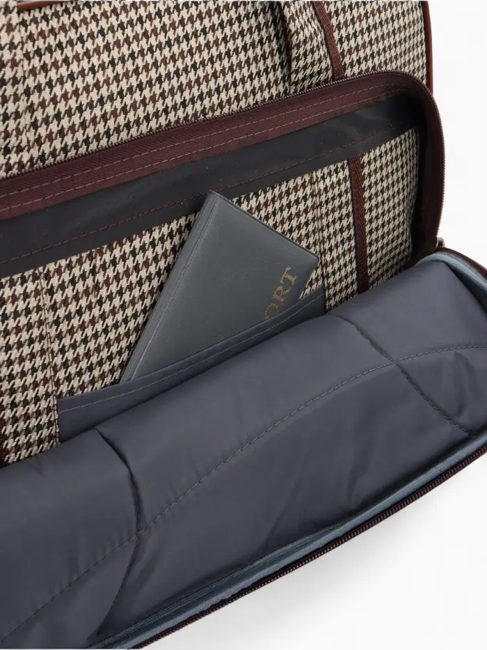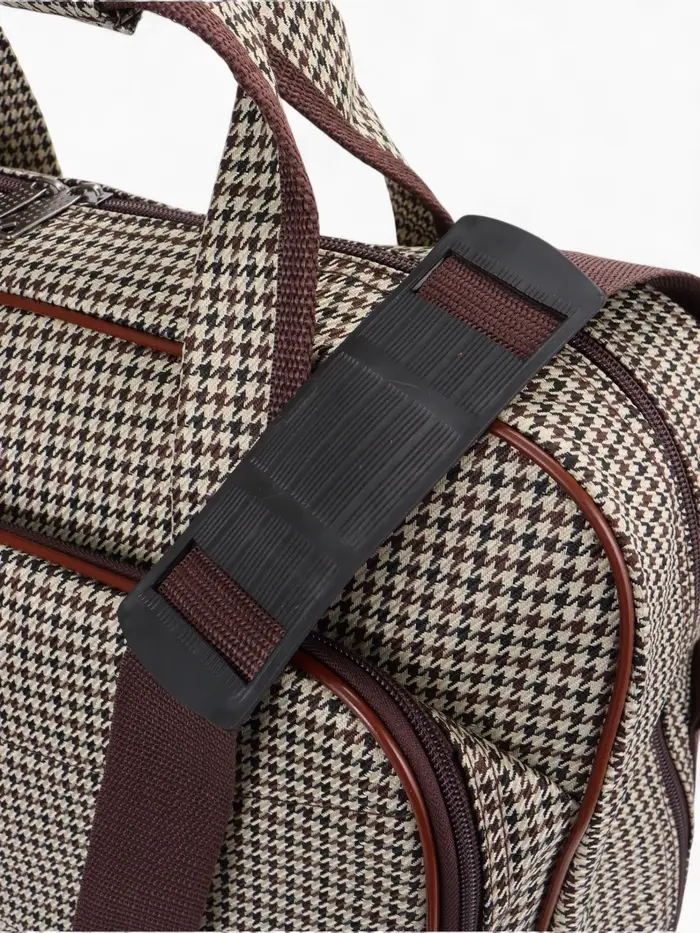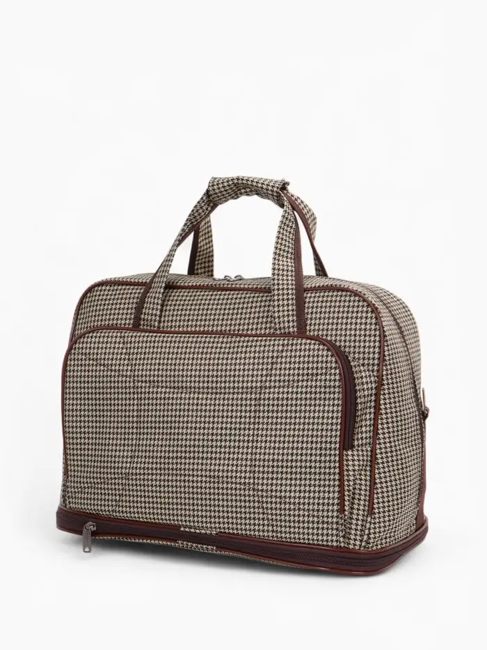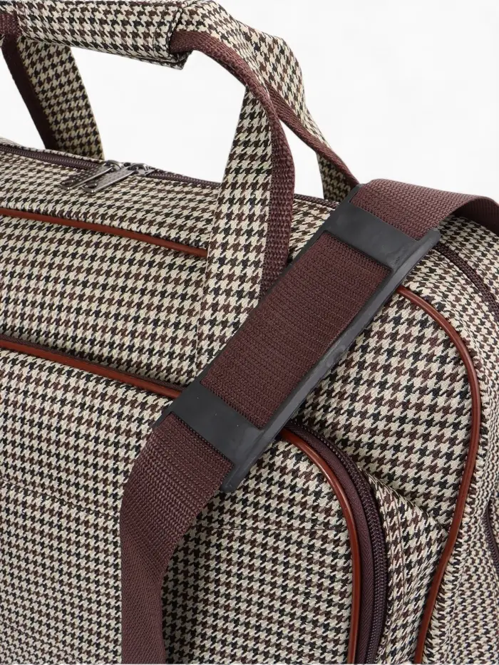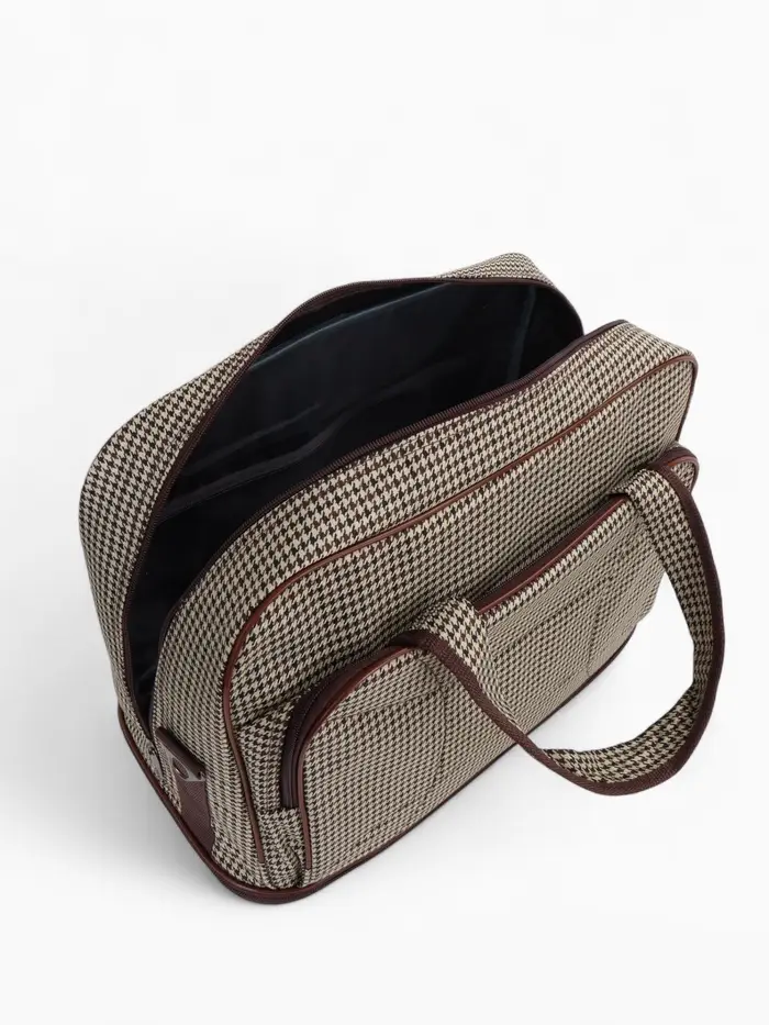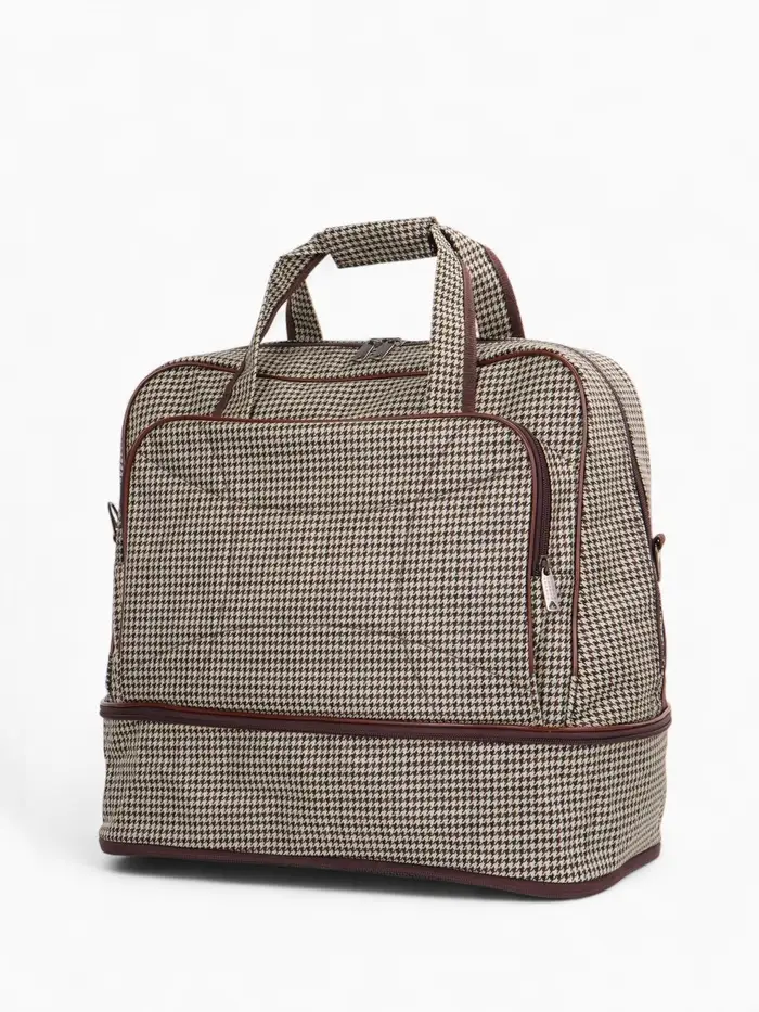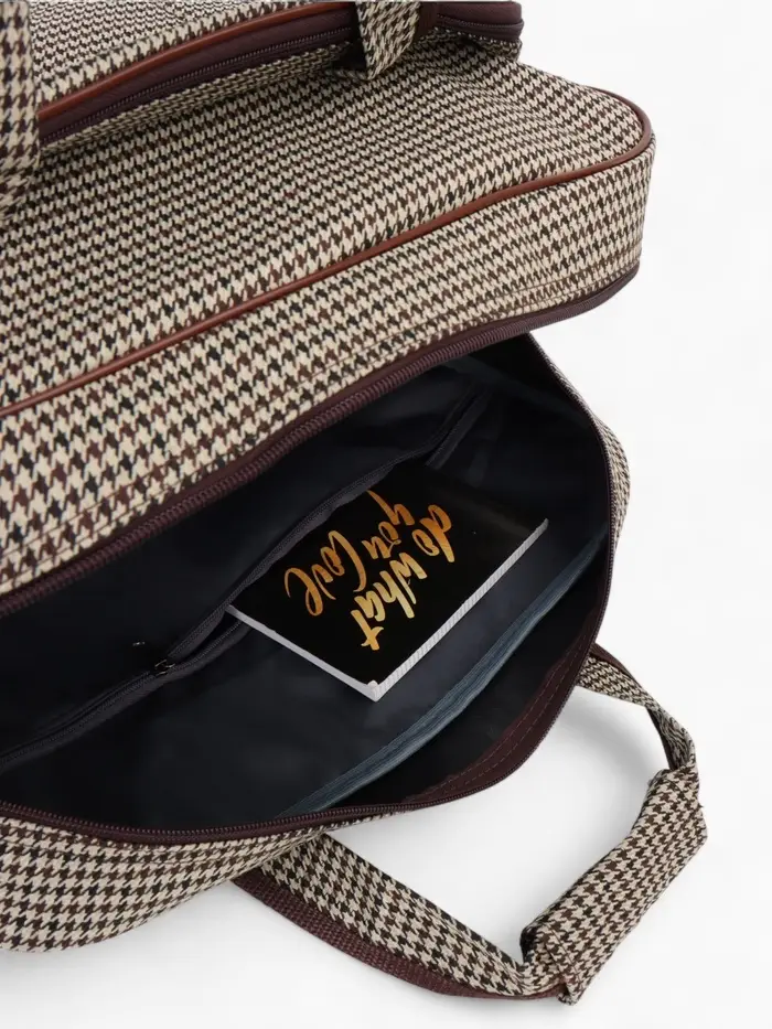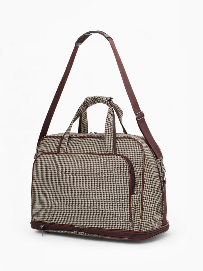 Элегантная сумка с узором "гусиная лапка" сочетает классический бежево-коричневый дизайн с современной функциональностью. Длинный регулируемый ремень обеспечивает комфортное ношение, а система увеличения объёма до 33 литров адаптируется под ваши потребности.