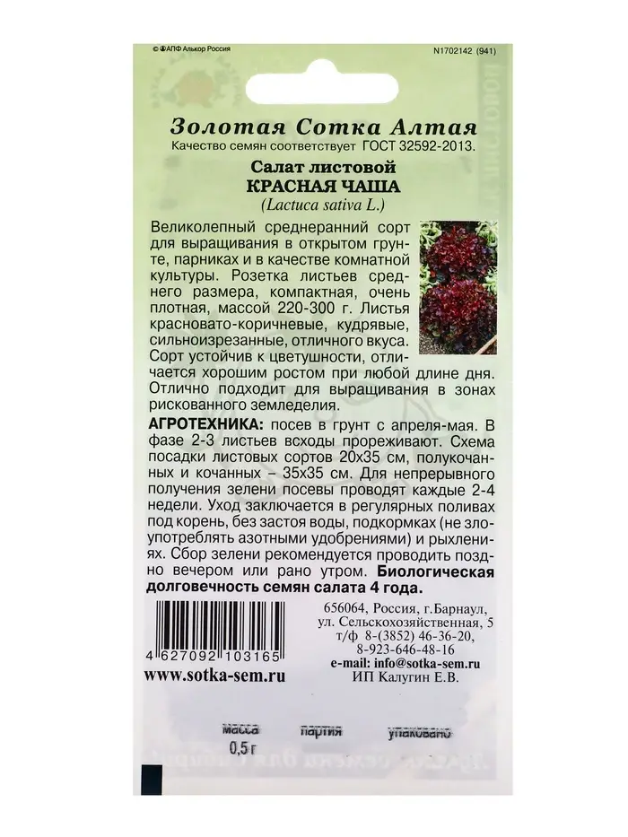 Семена Салат Красная чаша /Сотка/ 0,5г/ среднеран. листов. (можно выращивать в горшке)/*1500 1094222