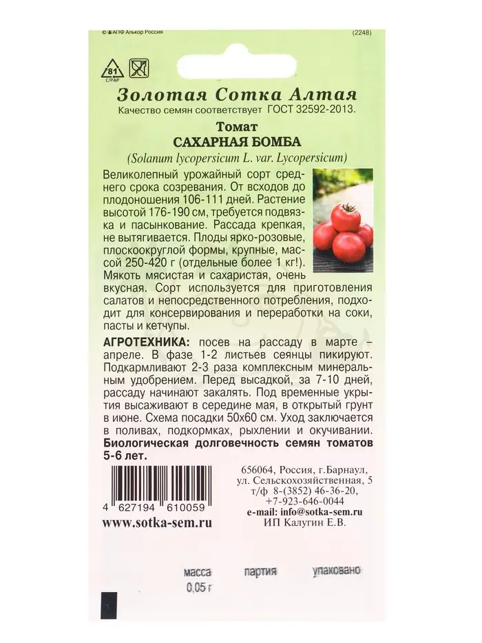 Семена Томат Сахарная бомба /Сотка/ 0,05 г/ среднесп. розовые 250-420г/*1500