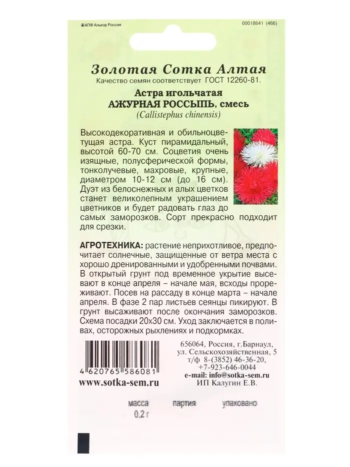Семена Астра Ажурная Россыпь смесь /Сотка/ 0,2г/ игол. 70см, d до 16см/*1500