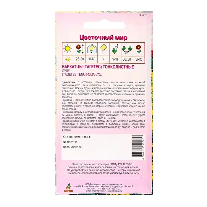 Растения можно высаживать напрямую в грунт с апреля по июнь. Для любителей раннего цветения возможен посев на рассаду с ноября, а также в апреле и мае. Бархатцы сорта «Лу Лу» имеют срок годности семян до трех лет, что позволяет гибко подходить к планированию вашего сада.