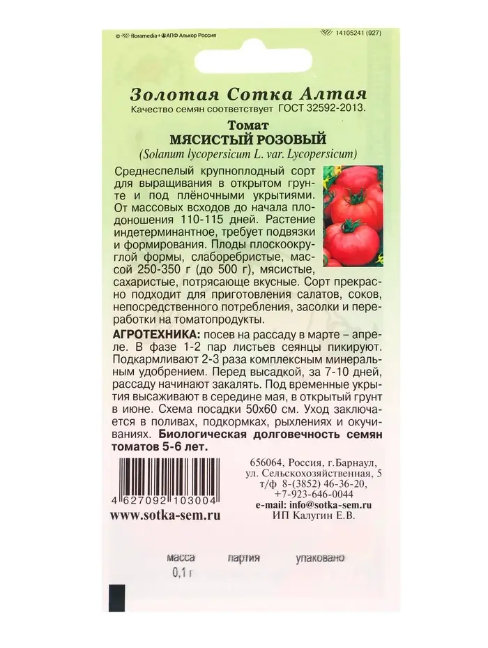 Семена Томат «Мясистый Розовый», 0.1 г, среднеспелый, индетерминантный, «Золотая Сотка Алтая»