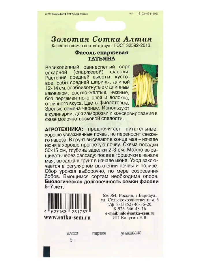 Семена Фасоль Татьяна /Сотка/ 5 г /спарж/*400