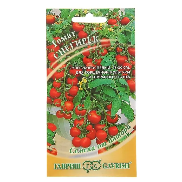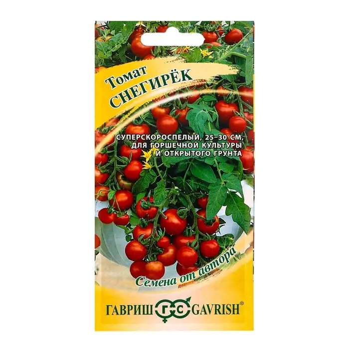 «Снегирёк» — это раннеспелый сорт помидоров с высоким содержанием сухих веществ. Техническая спелость наступает на 80–90-й день от всходов. Высота растения составляет 25–30 см.