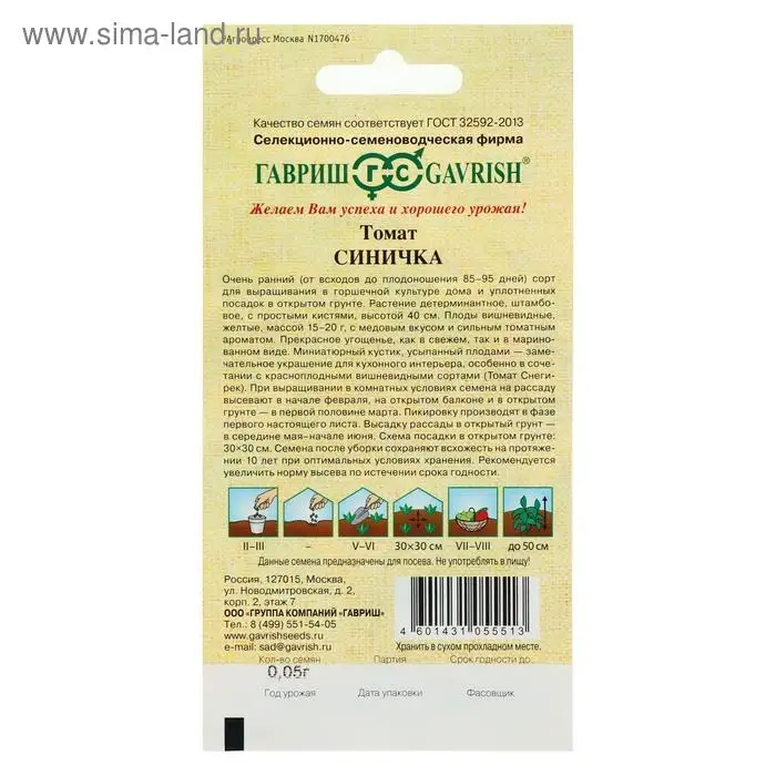 Семена Томат "Синичка", очень ранний, детерминантный,низкорослый, 0,05 г