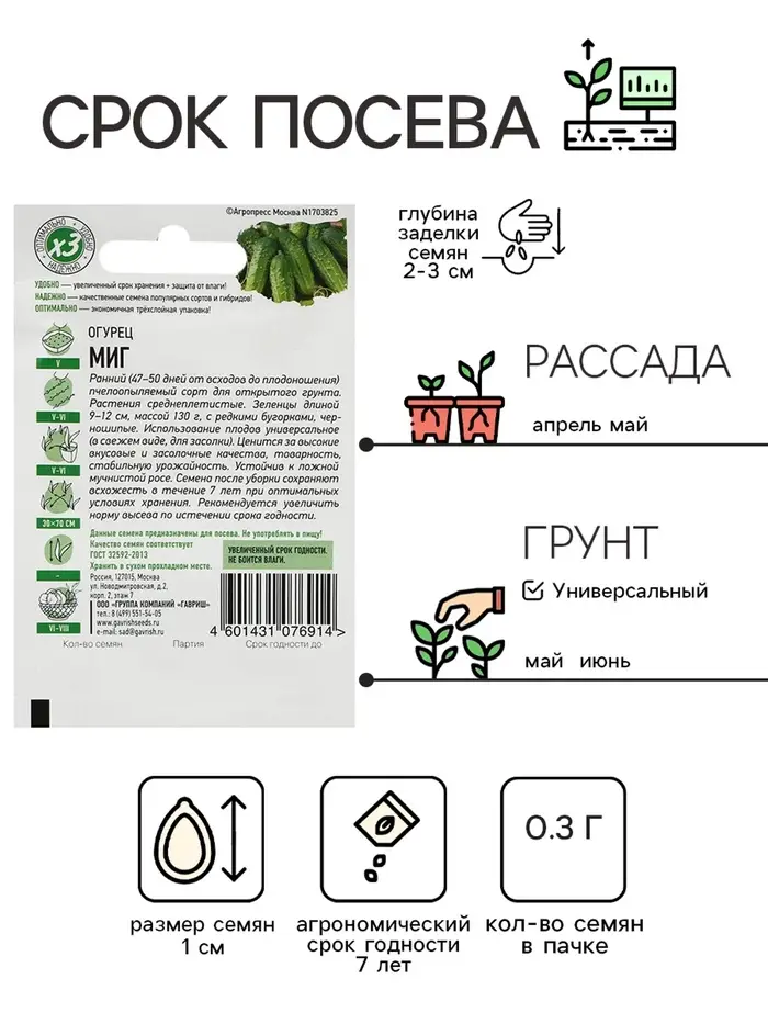 Семена Огурец "Миг", раннеспелый, пчелоопыляемый, 0,3 г серия ХИТ х3