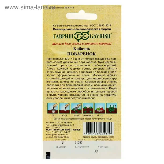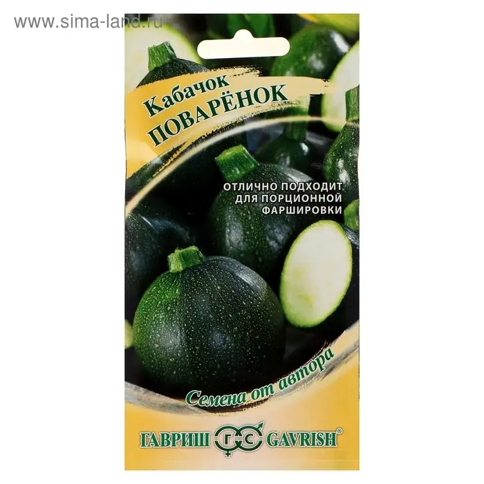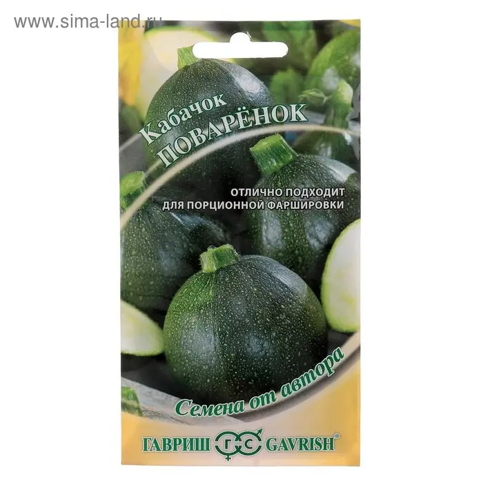 Раннеспелый (39-43 дня от полных всходов до первого сбора) урожайный сорт кабачка. Куст крупный, мощный, при этом компактный, стебель короткий. Плоды круглой формы светло-зеленые. Мякоть очень вкусная, нежная, содержит не большое количество сформированных семян. Молодые кабачки с тонкой кожицей используют для маринования кружочками, запекания, жарки. Круглая форма отлично подходит для фаршировки мясом, овощами (оригинальные зеленые «горшочки с крышечками»). Выращивается рассадным способом и прямым посевом в грунт. Хорошо отзывается на внесение органических удобрений и регулярный полив.