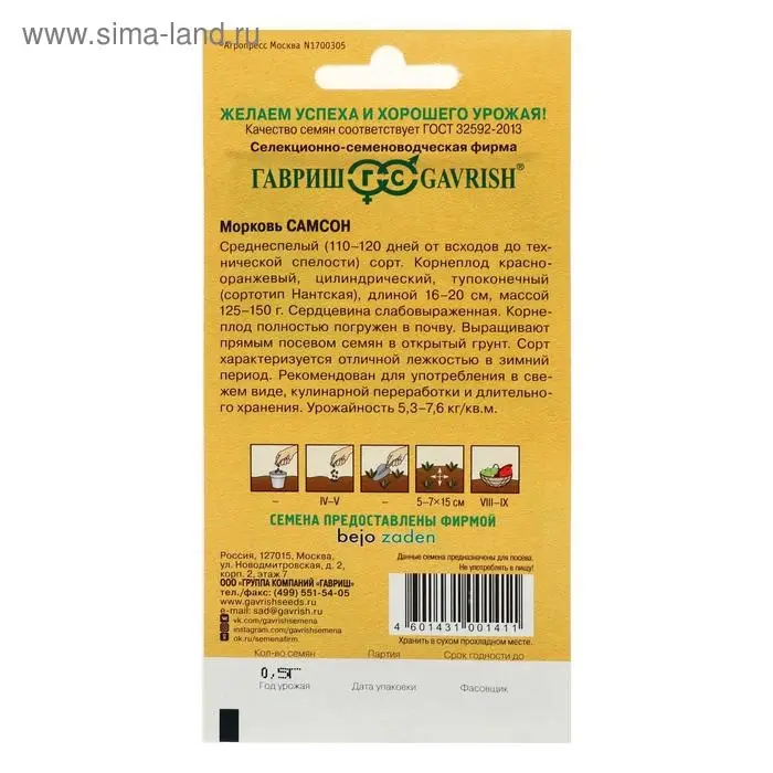 Среднеспелый (110–120 дней от всходов до технической спелости) сорт. Корнеплод красно-оранжевый, цилиндрический, тупоконечный (сортотип Нантская), длиной 16–20 см, массой 125–150 г. Сердцевина слабовыраженная. Корнеплод полностью погружен в почву. Выращивают прямым посевом семян в открытый грунт. Сорт характеризуется отличной лежкостью в зимний период. Рекомендован для употребления в свежем виде, кулинарной переработки и длительного хранения. Урожайность 5,3–7,6 кг/м2.