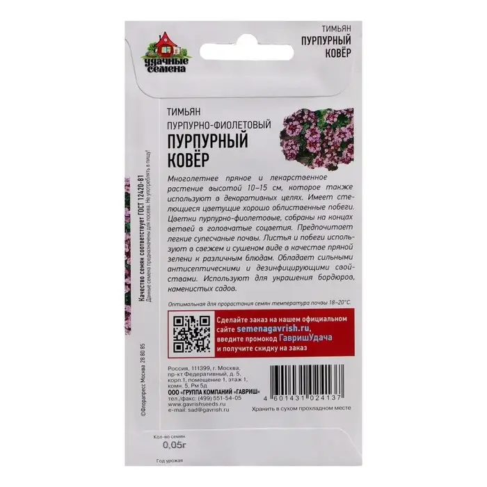 Семена Тимьян "Пурпурный ковер", ц/п, 0,03 г