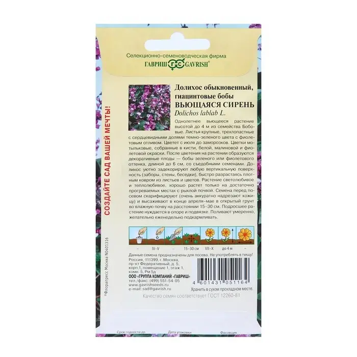 Семена цветов Долихос (Гиацинтовые бобы) "Вьющаяся сирень", ц/п, 4 шт