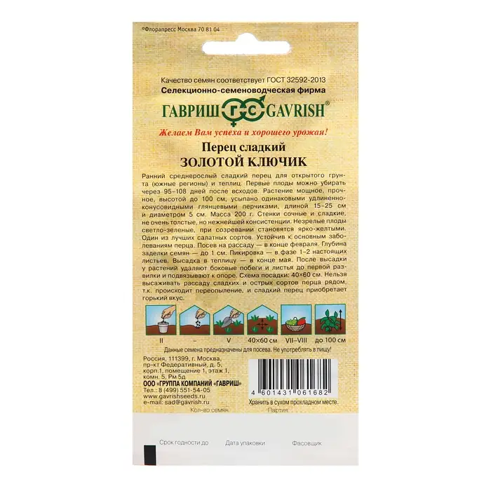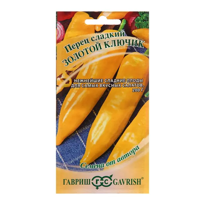 Перец сладкий Золотой ключик. Ранний среднерослый сладкий перец для открытого грунта и теплиц. Первые плоды можно убирать через 95-108 дней после появления всходов. Растение мощное, прочное, высотой до 100 см и выше, сплошь усыпано одинаковыми удлиненно-конусовидными глянцевыми плодами, длиной до 15-25 см и диаметром 5 см. Масса 200 г. Стенки сочные и сладкие, не очень толстые, но нежнейшей консистенции. Незрелые плоды светло-зеленые, при созревании становятся ярко-желтыми. Урожайность очень высокая.