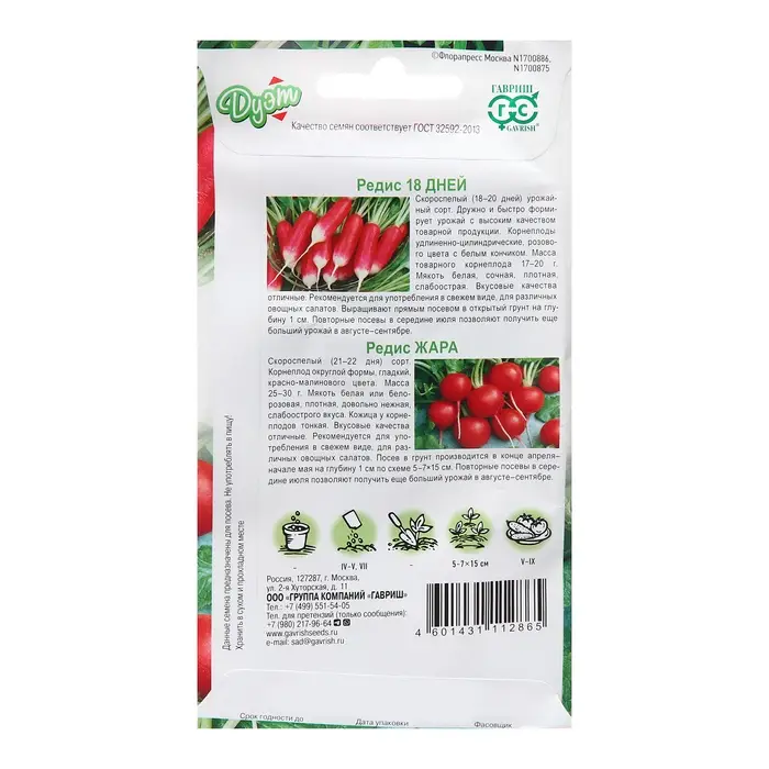 Семена Редис "18 дней" 2,0 г + "Жара" серия, ц/п, 2,0 г Дуэт Н21