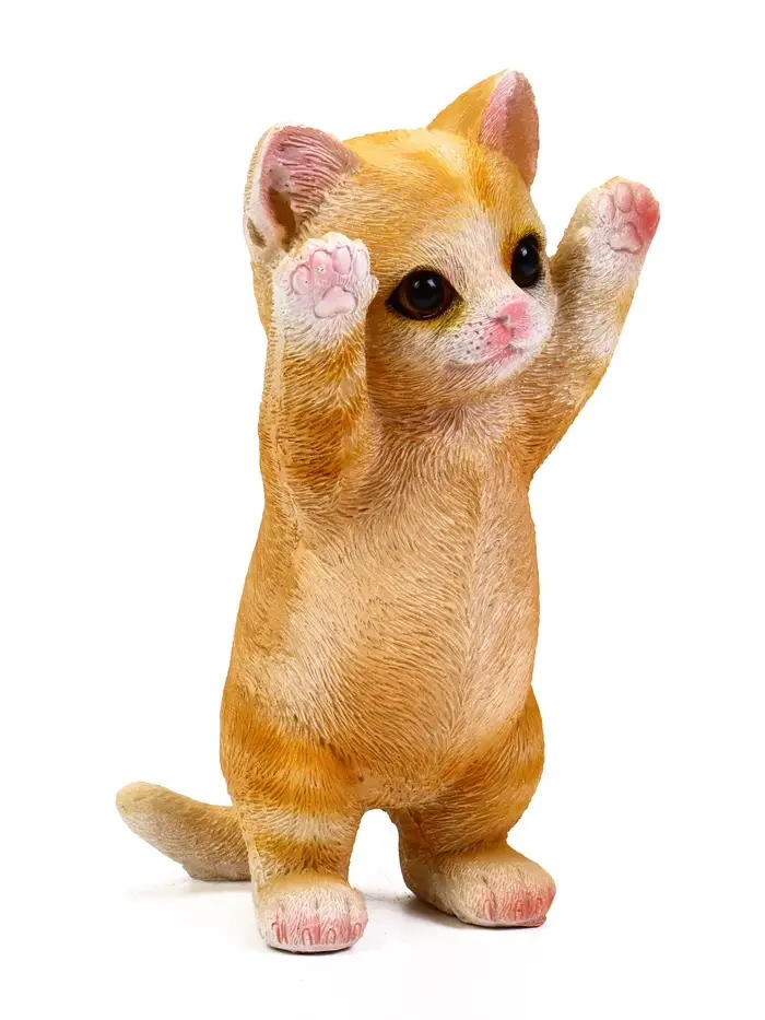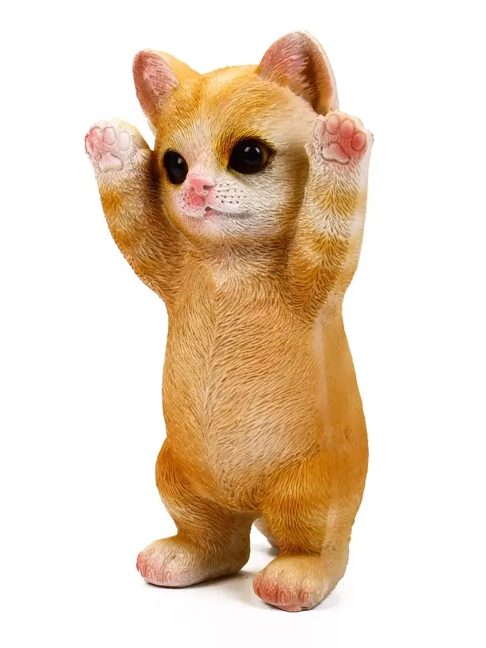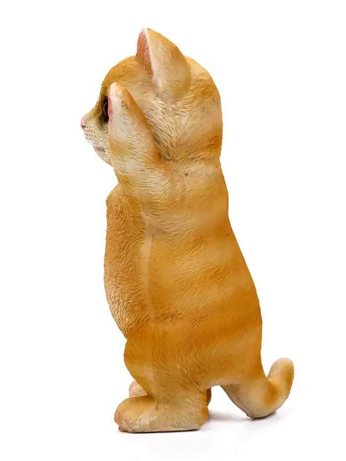 - Яркий внешний вид: Рыжий цвет делает фигурку хорошо заметной среди зелени. Котёнок выглядит динамично и добавляет пространству игривого настроения.