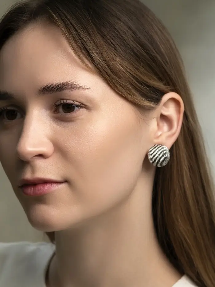 Главный элемент украшения — круглая плоскость, украшенная мелкой сетчатой структурой, имитирующей ткань с сотканными рубчиками. Эта особая техника придает поверхности серёжек необычную фактуру и создает приятный тактильный эффект, вызывая желание рассмотреть их подробнее. Регулярная сетка помогает удерживать покрытие и улучшает сцепляемость металла с кожей, облегчая процесс одевания и снятия серёжек.