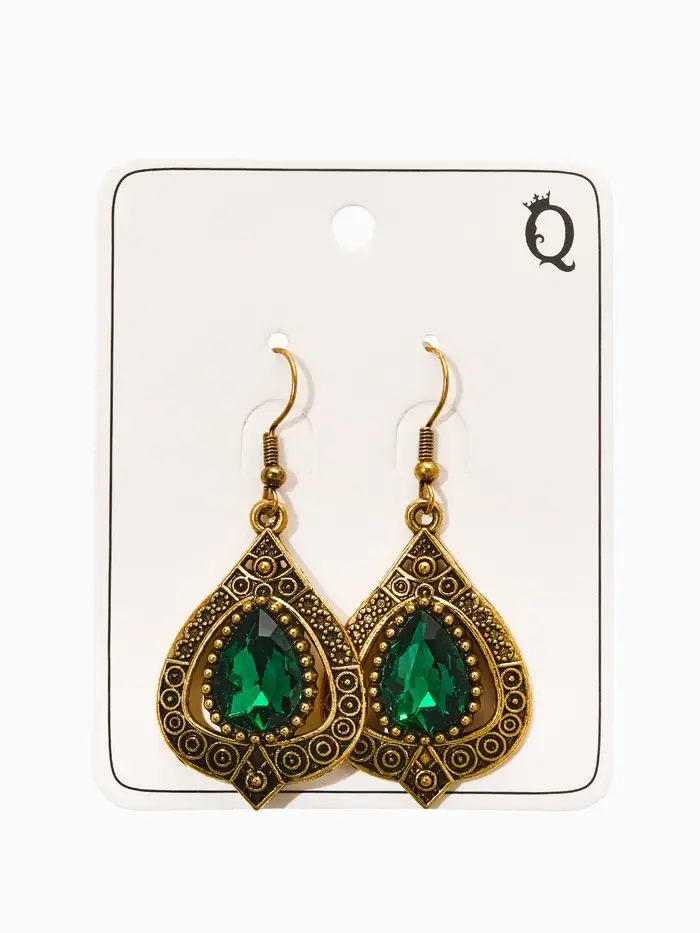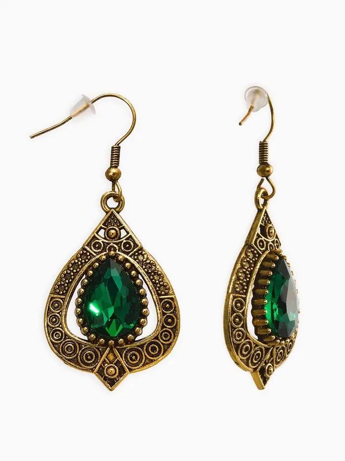 Серьги со стразми "Винтаж" капля, цвет изумрудный в чернёном золоте