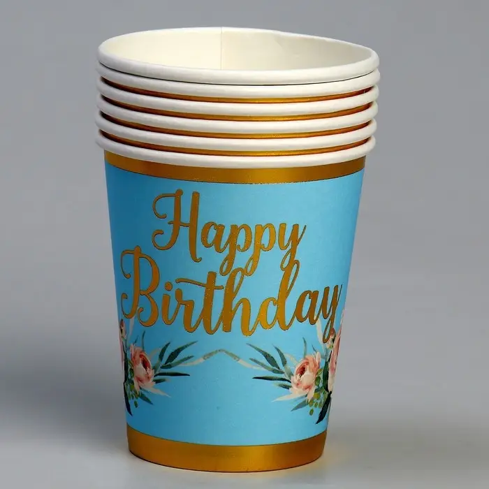 Стакан бумажный одноразовый «С днём рождения», в наборе 6 штук, голубой