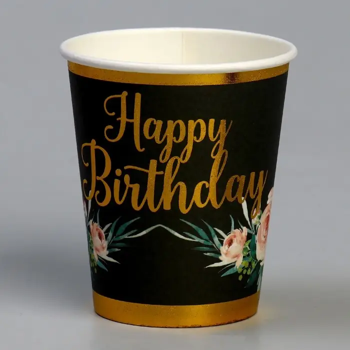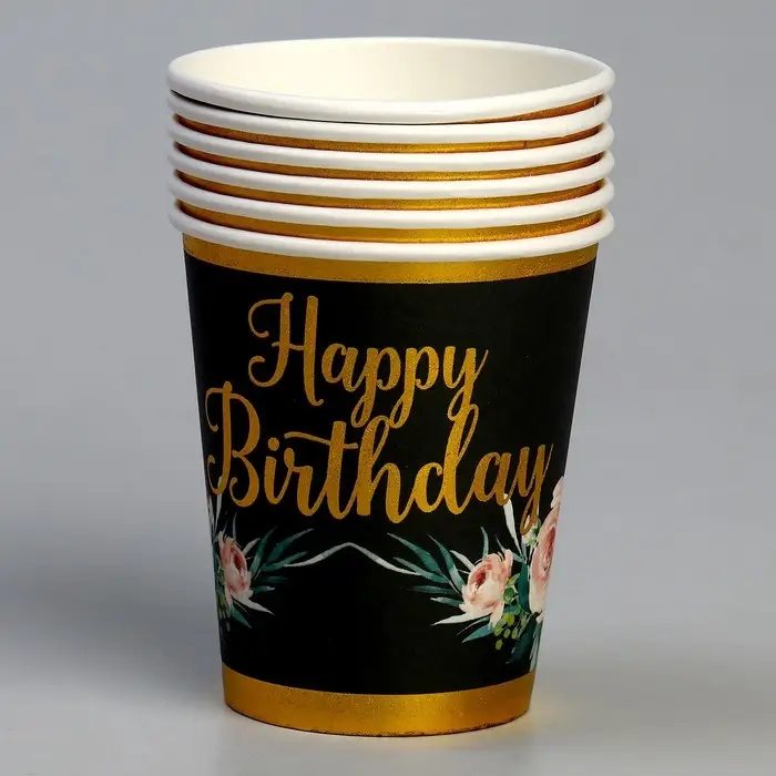 Стакан бумажный одноразовый «С днём рождения», в наборе 6 штук, чёрный