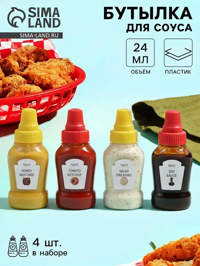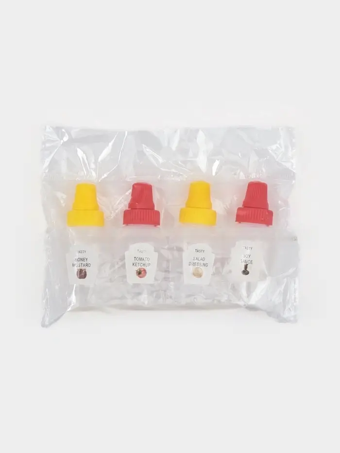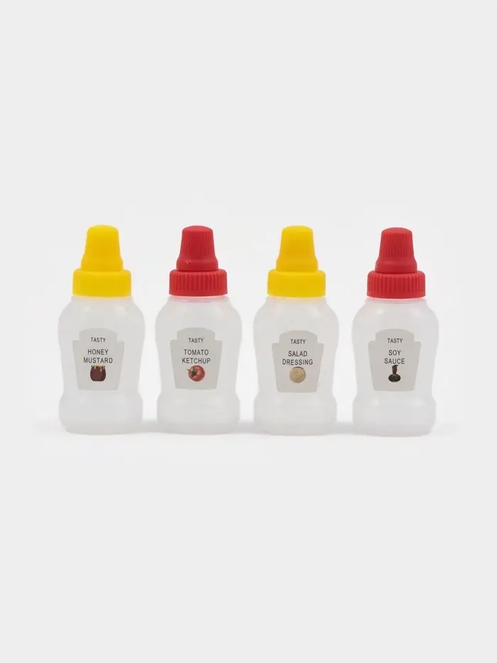 Прозрачные мини-бутылочки для соуса — четыре штуки, чтобы каждый вкус остался на своём месте. По 24 мл — ровно столько, сколько нужно, чтобы не переливать, не смешивать и не ждать, пока закончится.