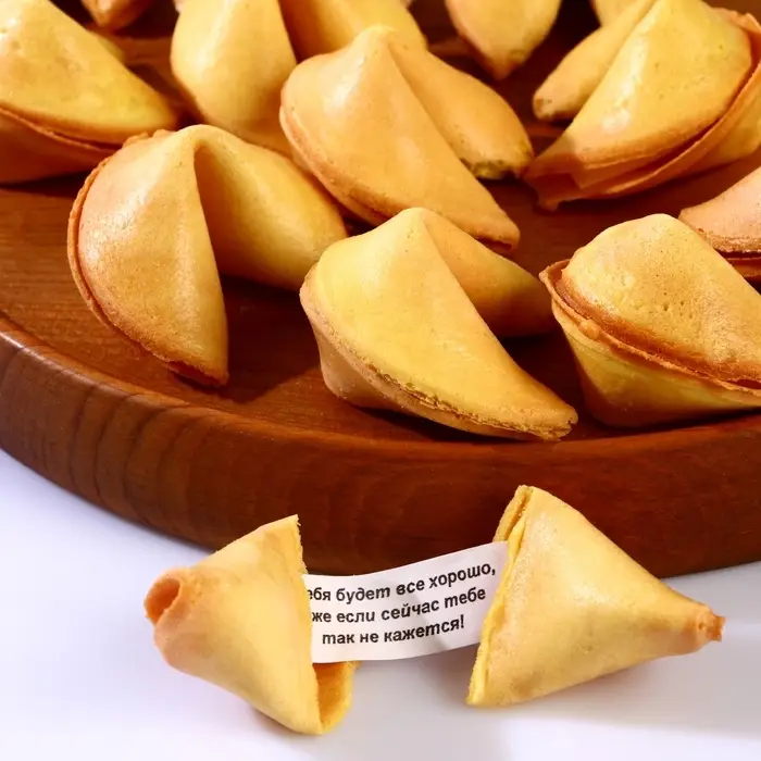 Печенье с предсказанием удачи представляет собой небольшое хрустящее лакомство, в котором запечен листочек с предсказанием. Печенье может стать не только вкусным десертом, но и отличным вариантом подарка близкому человеку. Он обязательно оценит неординарный подход, а оригинальное предсказание-сюрприз оставит после себя массу положительных эмоций! Печенье с предсказанием также может стать отличным дополнением к основному подарку на любой праздник или способом порадовать близкого и любимого человека просто так.