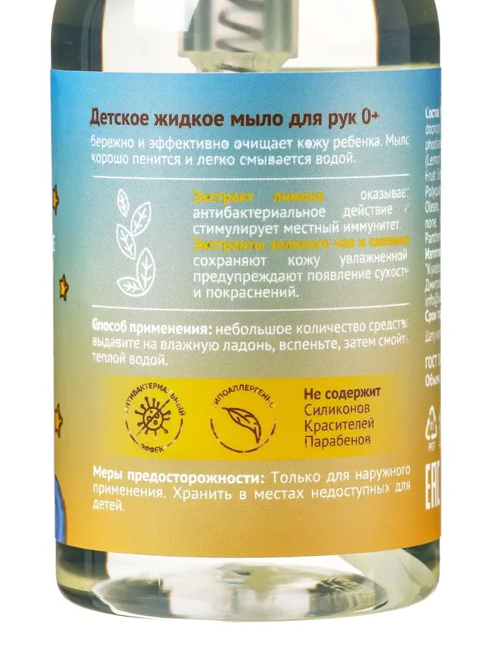 Детское жидкое мыло для рук бережно и эффективно очищает кожу ребенка.