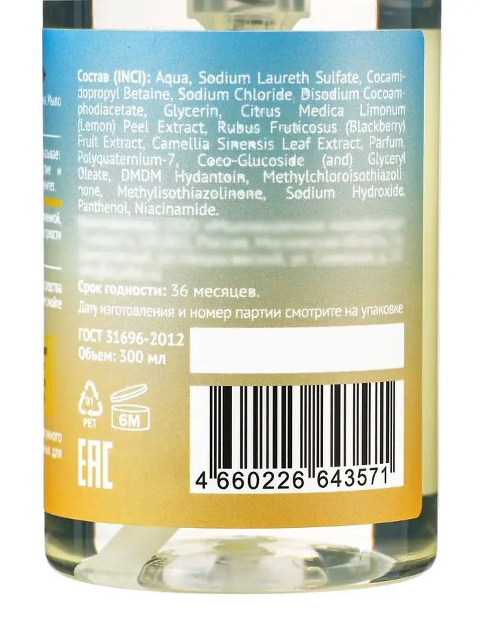 Состав: Aqua, Sodium Laureth Sulfate, Cocami-dopropyl Betaine, Sodium Chloride, Disodium Cocoam-phodiacetate, Glycerin, Citrus Medica Limonum (Lemon) ,Peel Extract, Rubus Fruticosus (Blackberry), Fruit Extract, Camellia Sinensis, Leaf Extract, Parfum, Polyquaternium-7, Coco-Glucoside (and) Glyceryl Oleate, DMDM Hydantoin, Methylchloroisothiazoli-none, Methylisothiazolinone, Sodium Hydroxide, Panthenol, Niacinamide.