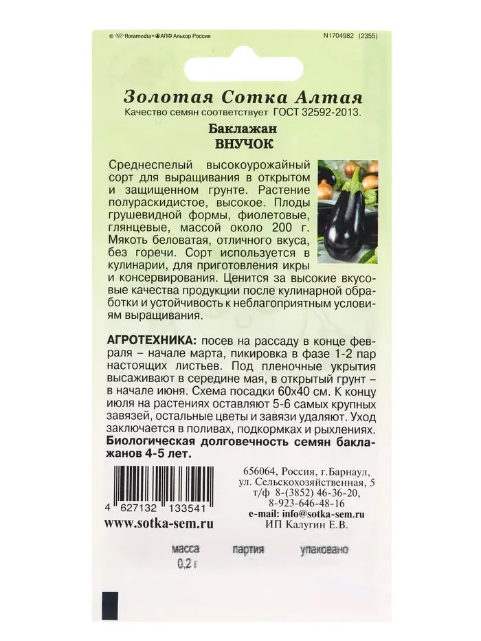 Семена Баклажан «Внучок», 0.2 г, среднеспелый, грушевидный «Золотая Сотка Алтая»
