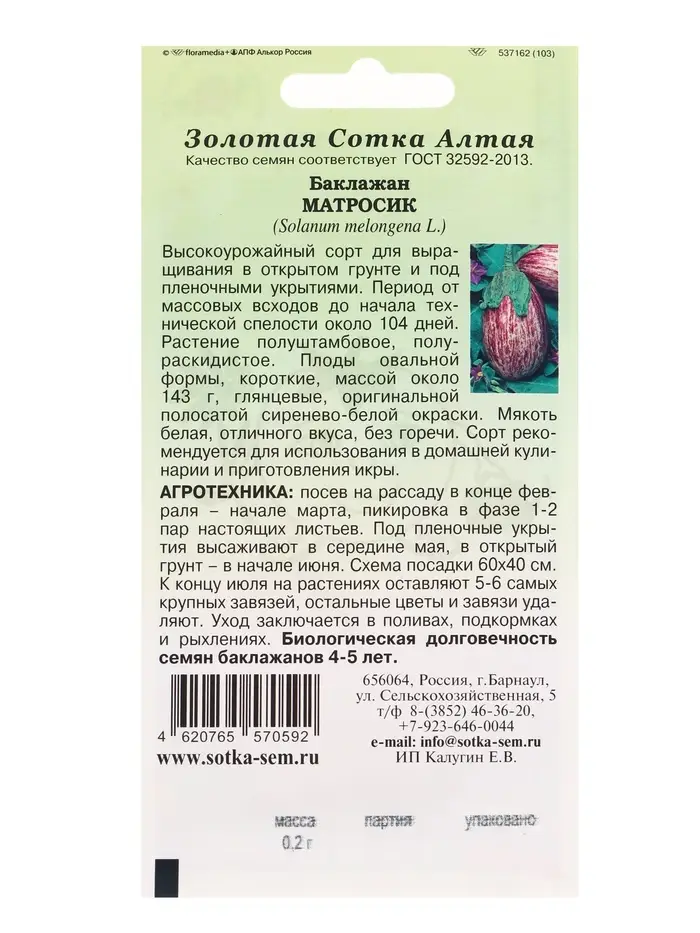 Семена Баклажан «Матросик», 0.2 г, среднеспелый, полосатый «Золотая Сотка Алтая»