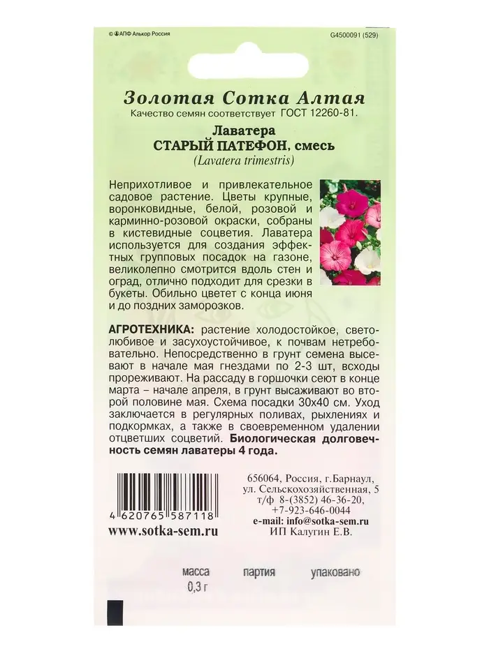 Семена Лаватера Старый Патефон /Сотка/ 0,3г/ смесь 100см,d-10см/*900
