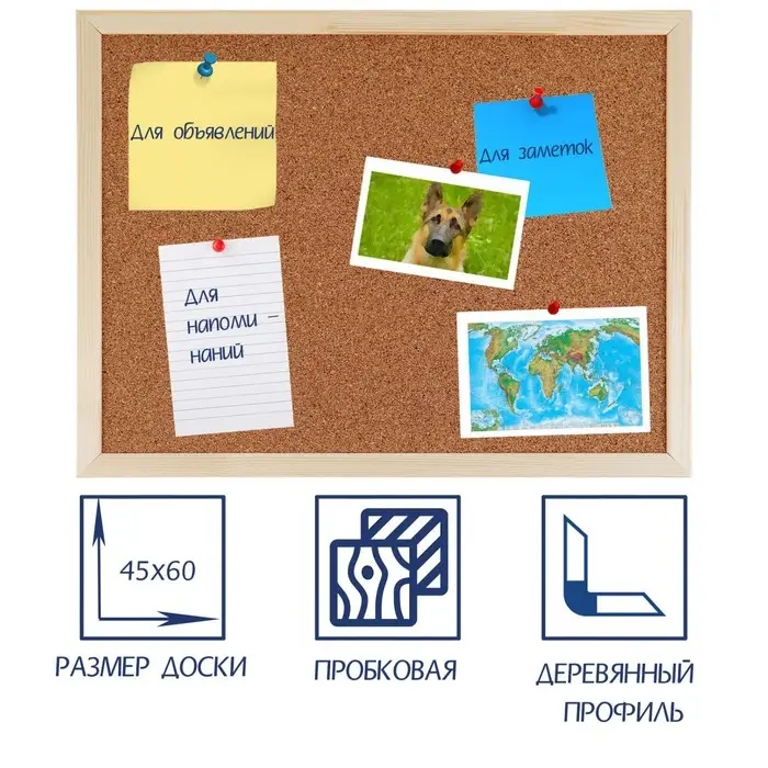 Доска пробковая серии СТАНДАРТ предназначена для размещения информации на бумажных носителях (рисунки, схемы, таблицы, фотографии и т.д.) при проведении презентаций, совещаний, лекций, семинаров, тренингов и прочих подобных мероприятий. Подходит для использования в квартирах, в офисах, образовательных и других учреждениях.