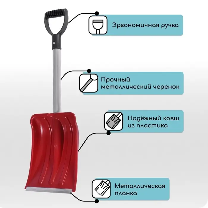 Лопата для уборки снега, автомобильная, пластиковый ковш 380 × 370 мм, алюминиевая планка, алюминиевый черенок, с ручкой