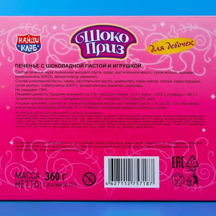Печенье «Шокоприз» с шоколадной пастой и игрушкой, яйцо-сюрприз, для девочек, 15 г