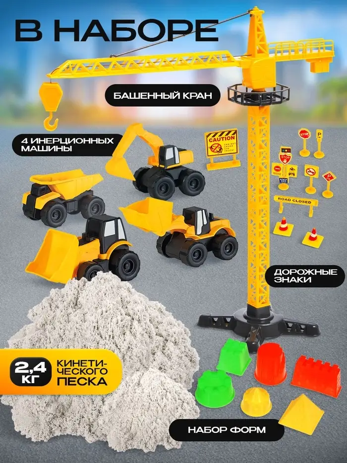 - Комплект строительной техники: четыре инерционные машинки готовы к работе на площадке. Устойчивое основание крана делает игру безопасной и стабильной.