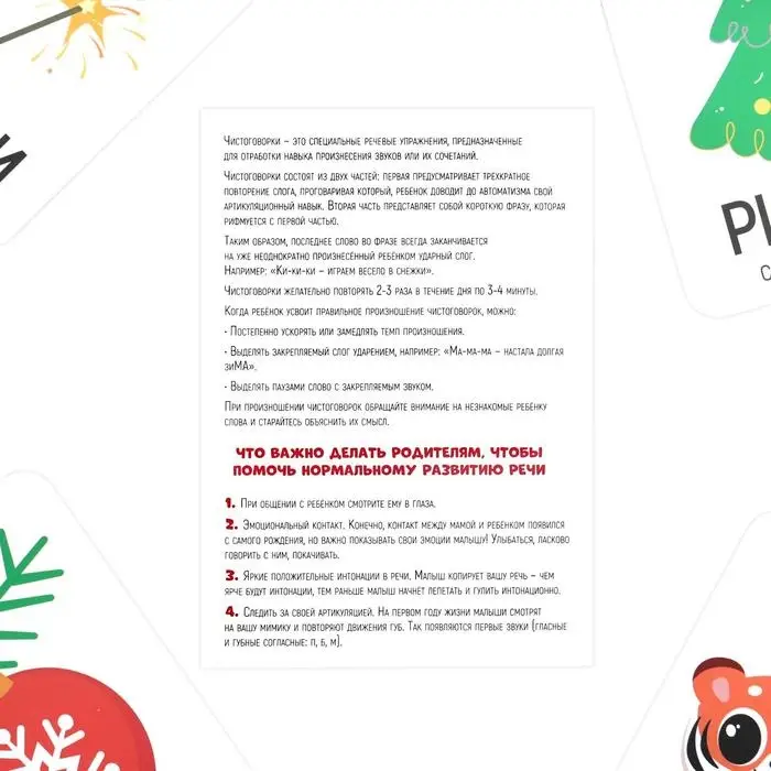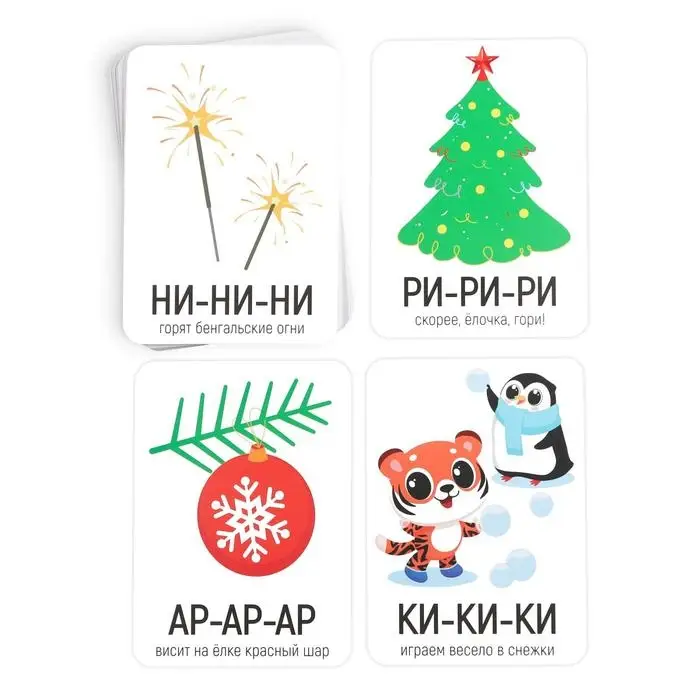 Перед вами набор обучающих карточек для развития речи, в которых малыша ждут забавные картинки и чистоговорки, связанные с зимой и Новым годом. Они научат ребёнка произносить сложные звуки, чувствовать ритм, улучшить произношение и позволят интересно провести время с родителями.