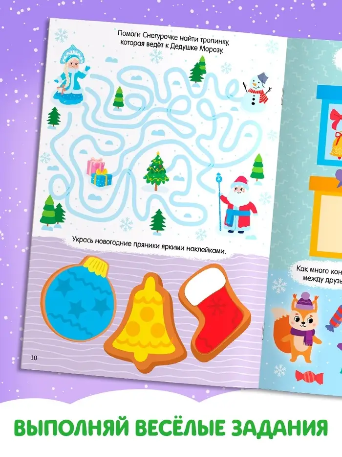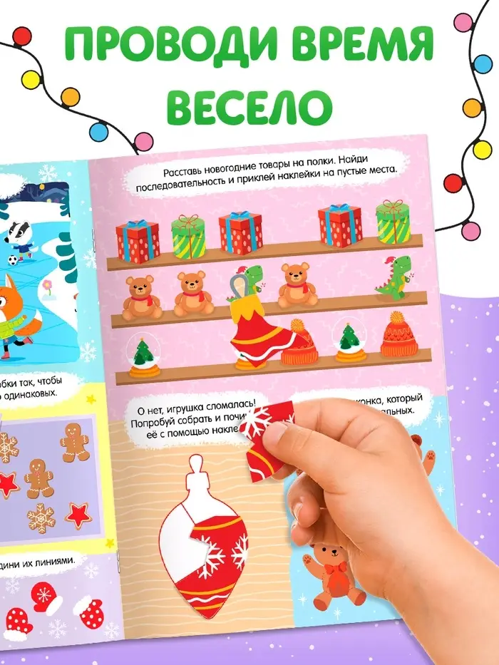 «Новогодние задачки» — это активити-книга, где зима начинается с первой страницы. Расставь новогодние товары на полки, укрась новогодние пряники, помоги Снегурочке найти тропинку — и всё это с помощью 80 многоразовых наклеек и заданий, которые учат думать, а не просто клеить.