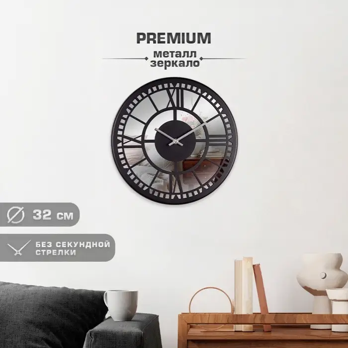 Часы настенные, интерьерные, бесшумные, d-32 см, металл с зеркалом