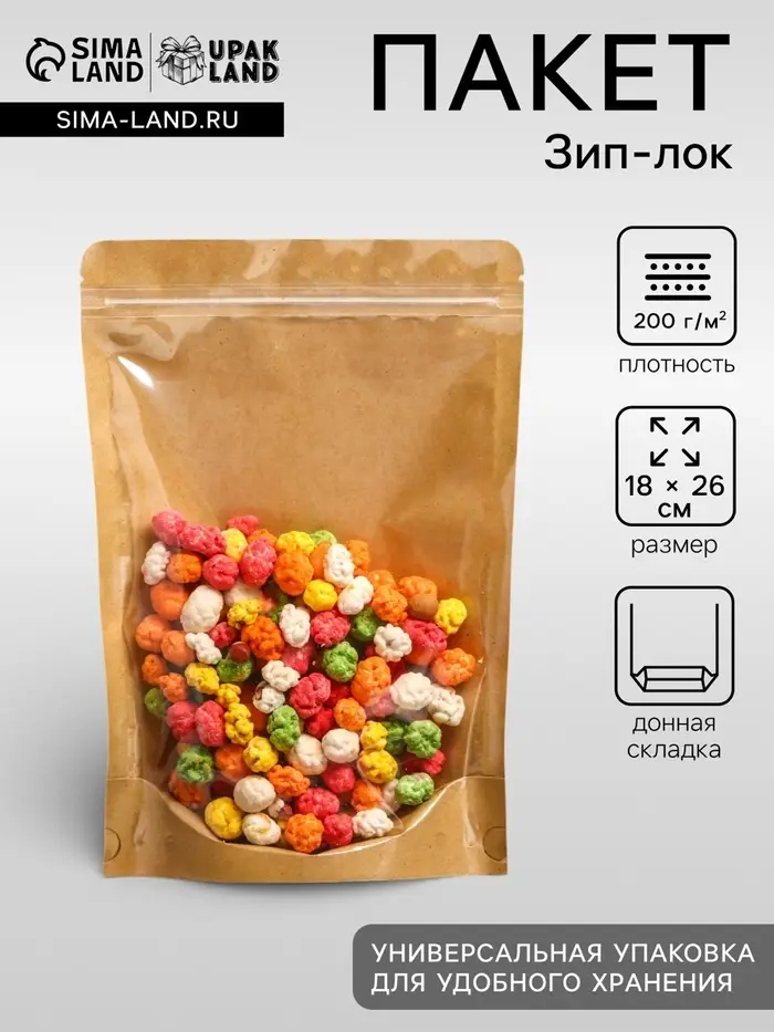 - Надёжный замок Zip-lock: Герметичная застёжка многократного использования плотно закрывается и защищает содержимое от влаги, пыли и рассыпания. Подходит для продуктов, требующих герметичности: крупы, орехи, сухофрукты, чай, кофе.